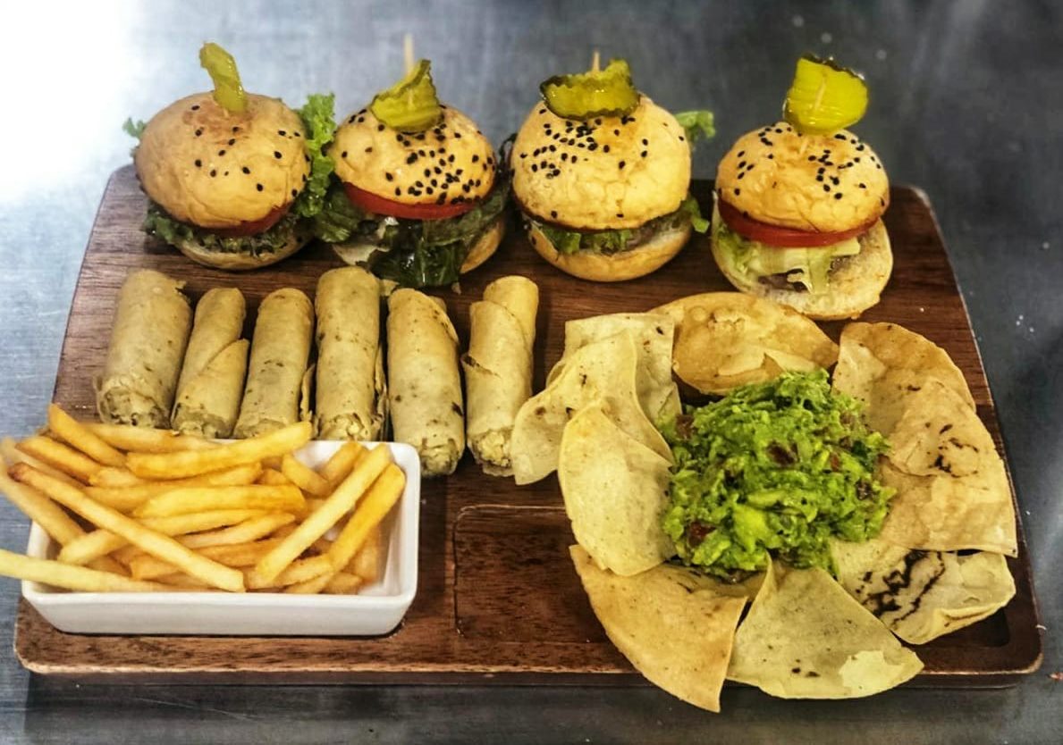 Mini hamburguesas o taquitos de pollo, guacamole, totopos y papas a la francesa.