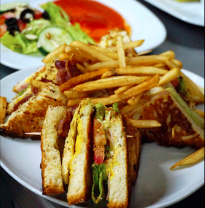 Pechuga de pollo, tocino, jamón, queso gouda, lechuga, jitomate y aguacate. Acompañado de papas a la francesa