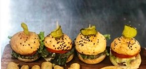 Mini hamburguesas o taquitos de pollo, guacamole, totopos y papas a la francesa.
