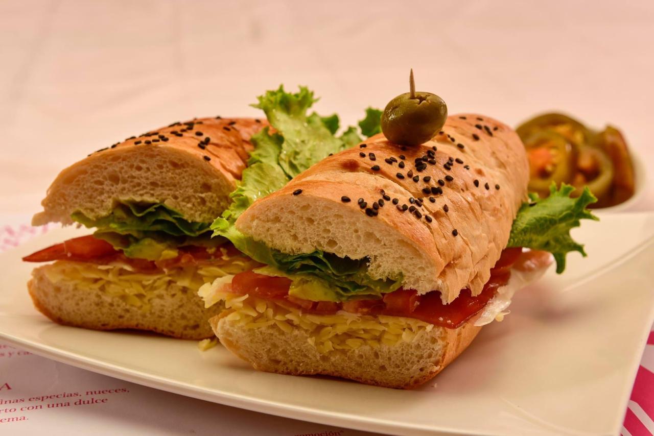 Jamón o pechuga de pavo y queso gouda, preparado con lechuga, jitomate y aguacate.
