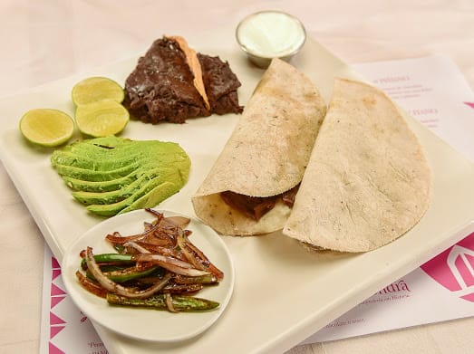 Acompañados de chiles toreados, aguacate, frijoles de la hoya y crema.