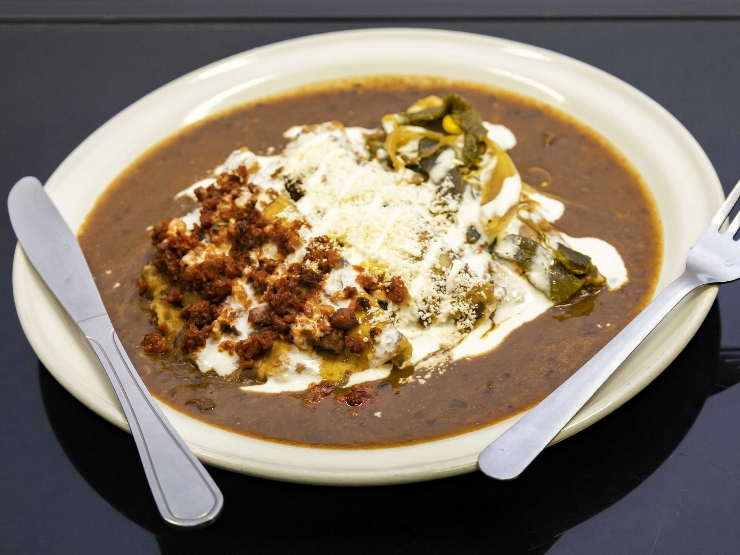 (3 Piezas) rellenas de pollo, acompañadas de rajas poblanas, queso panela, chorizo, cebolla curtida y crema natural.