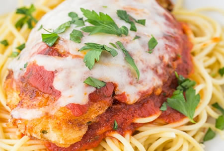 Milanesa de pollo rellena de jamón y queso manchego, empanizada y servida con salsa pomodoro y aderezo parmesano.