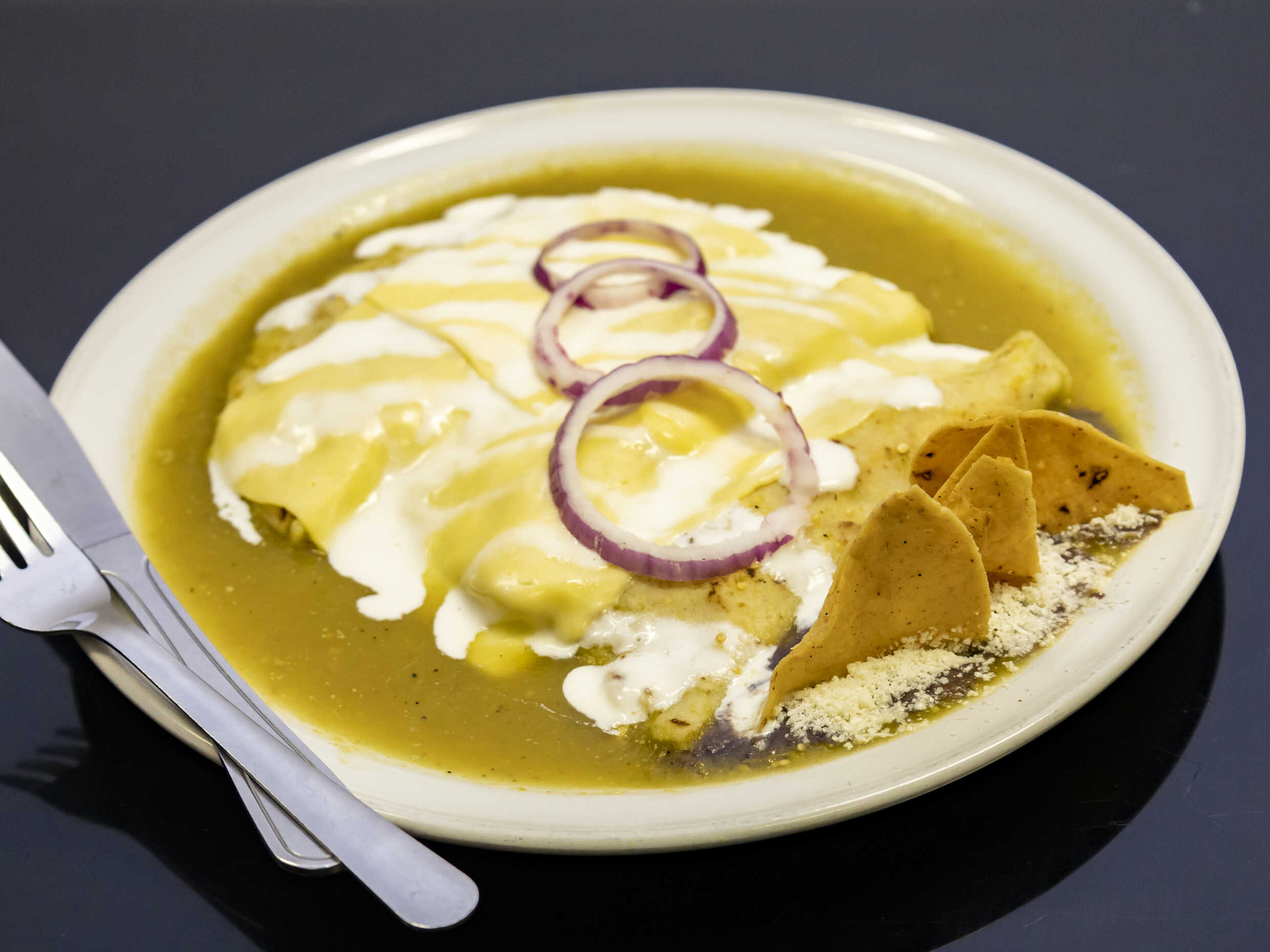 Tradicionales chilaquiles rojos o verdes, acompañados con frijoles, queso y cebolla curtidas.