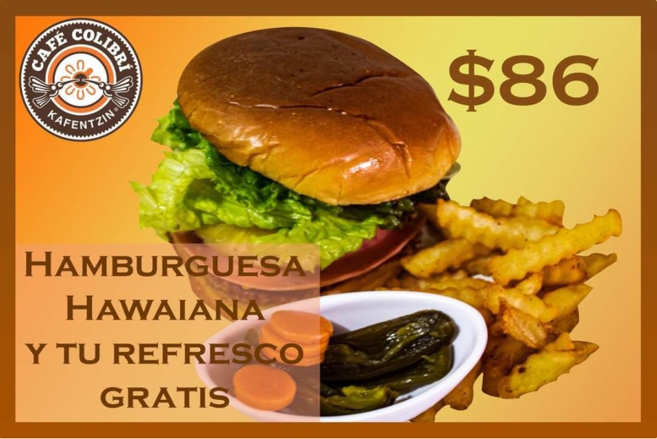 Carne hecha encasa (100 gr), jamón de pavo, piña asada y queso tipo americano, acompañada de papas a la francesa.
