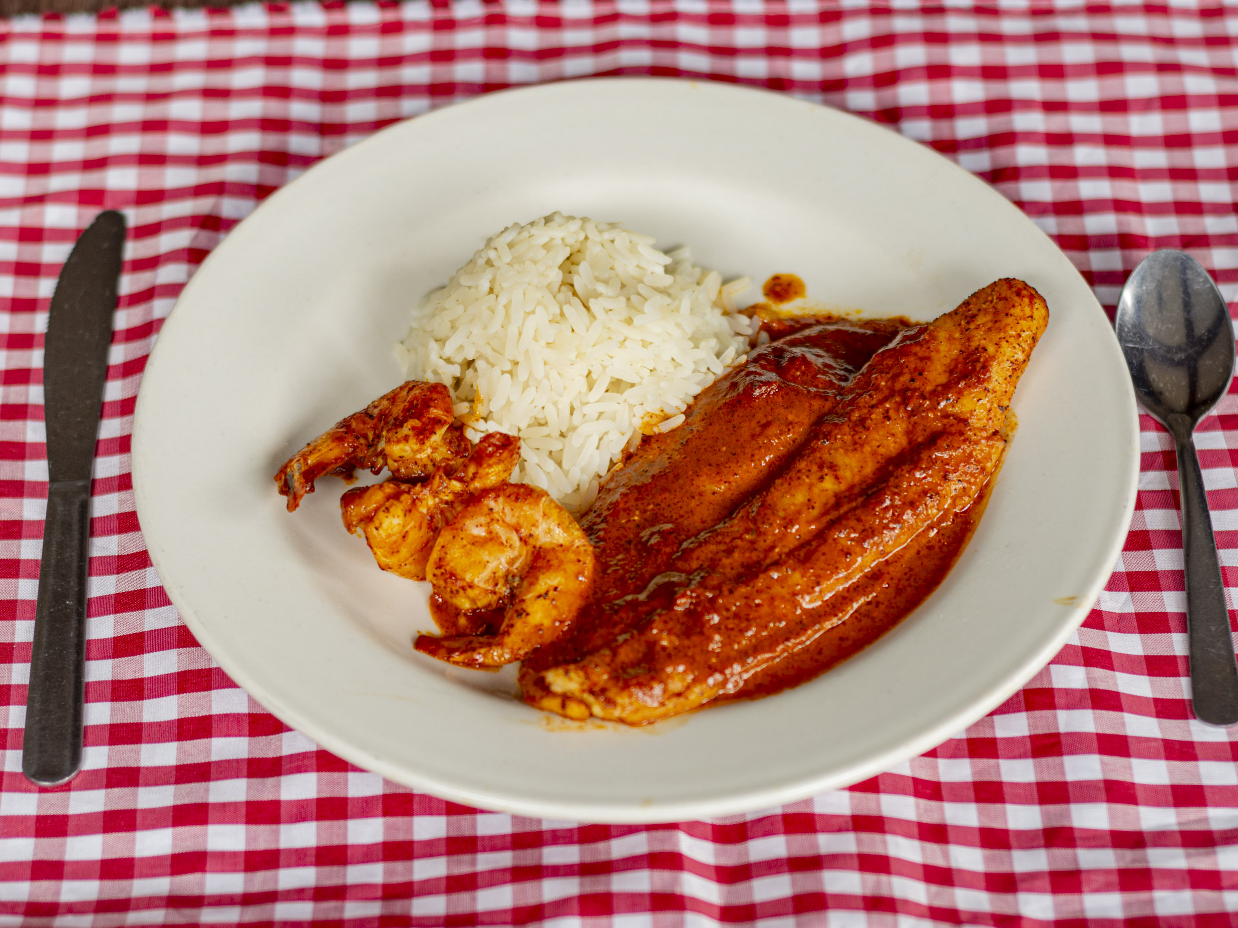 200 Gr. de filete preparado al achiote, acompañado de una cama de arroz blanco con camarones.