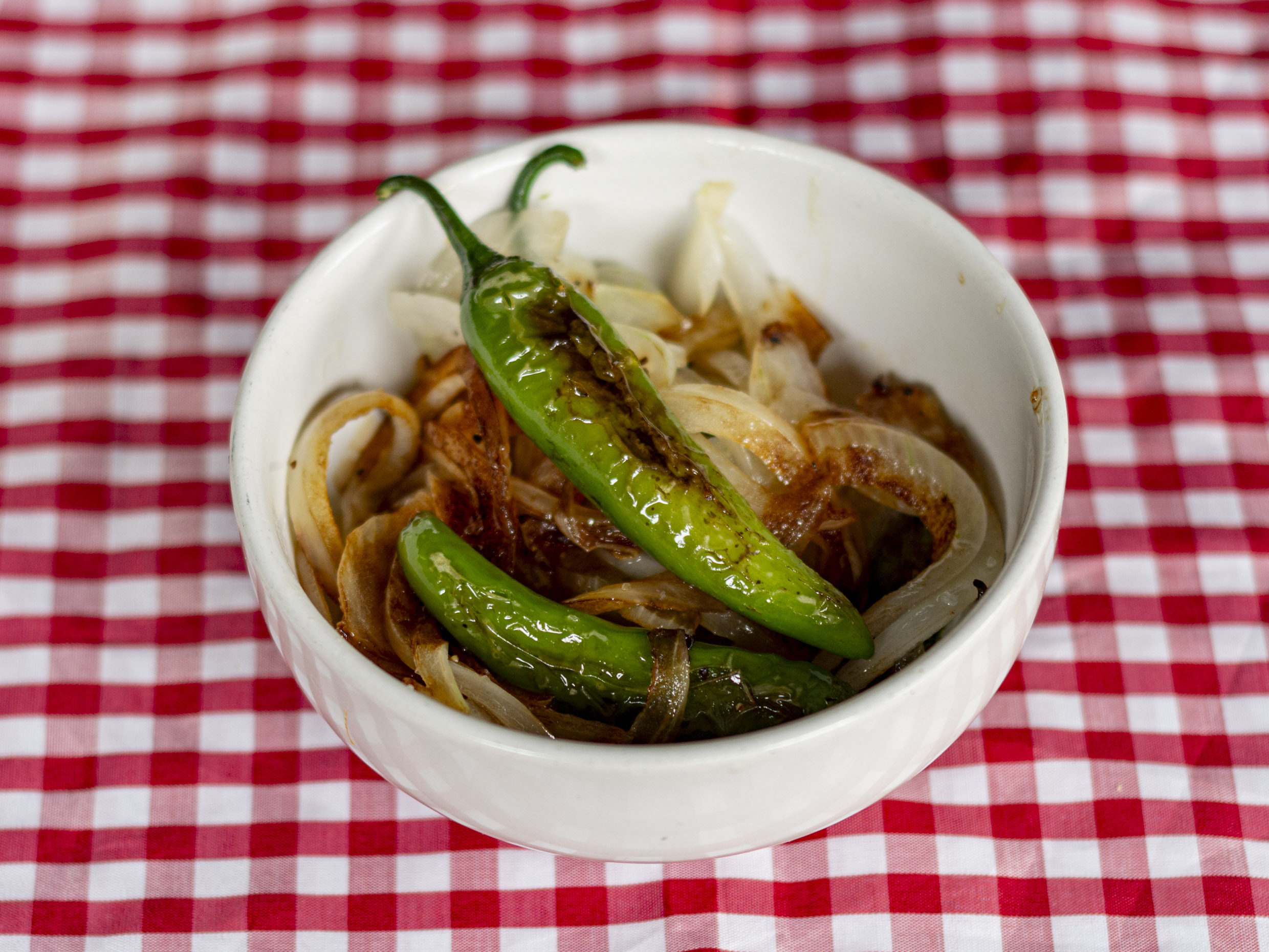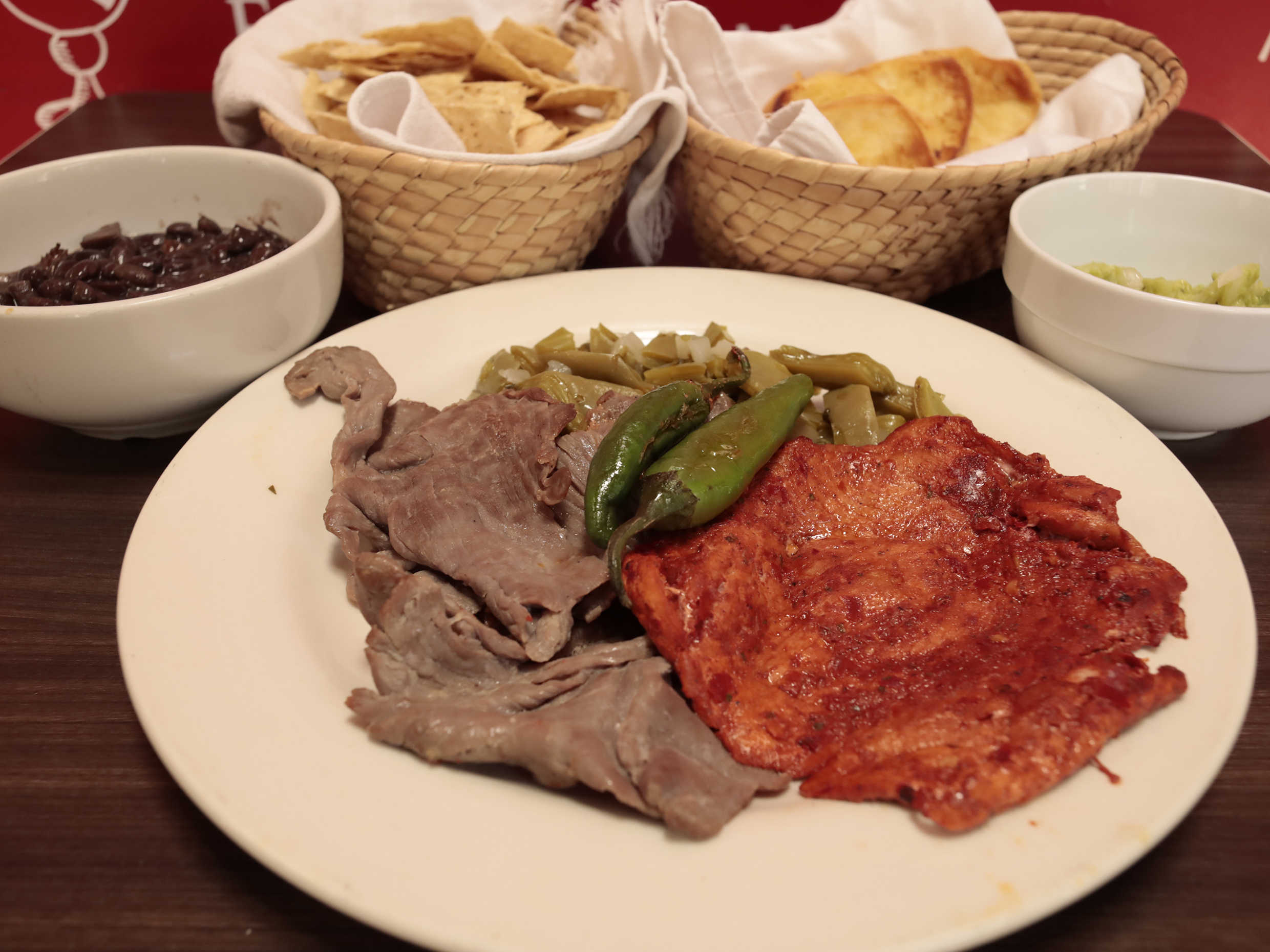 200 Gr. de carne enchilada y cecina servida con nopales, frijoles charros, guacamole y totopos.