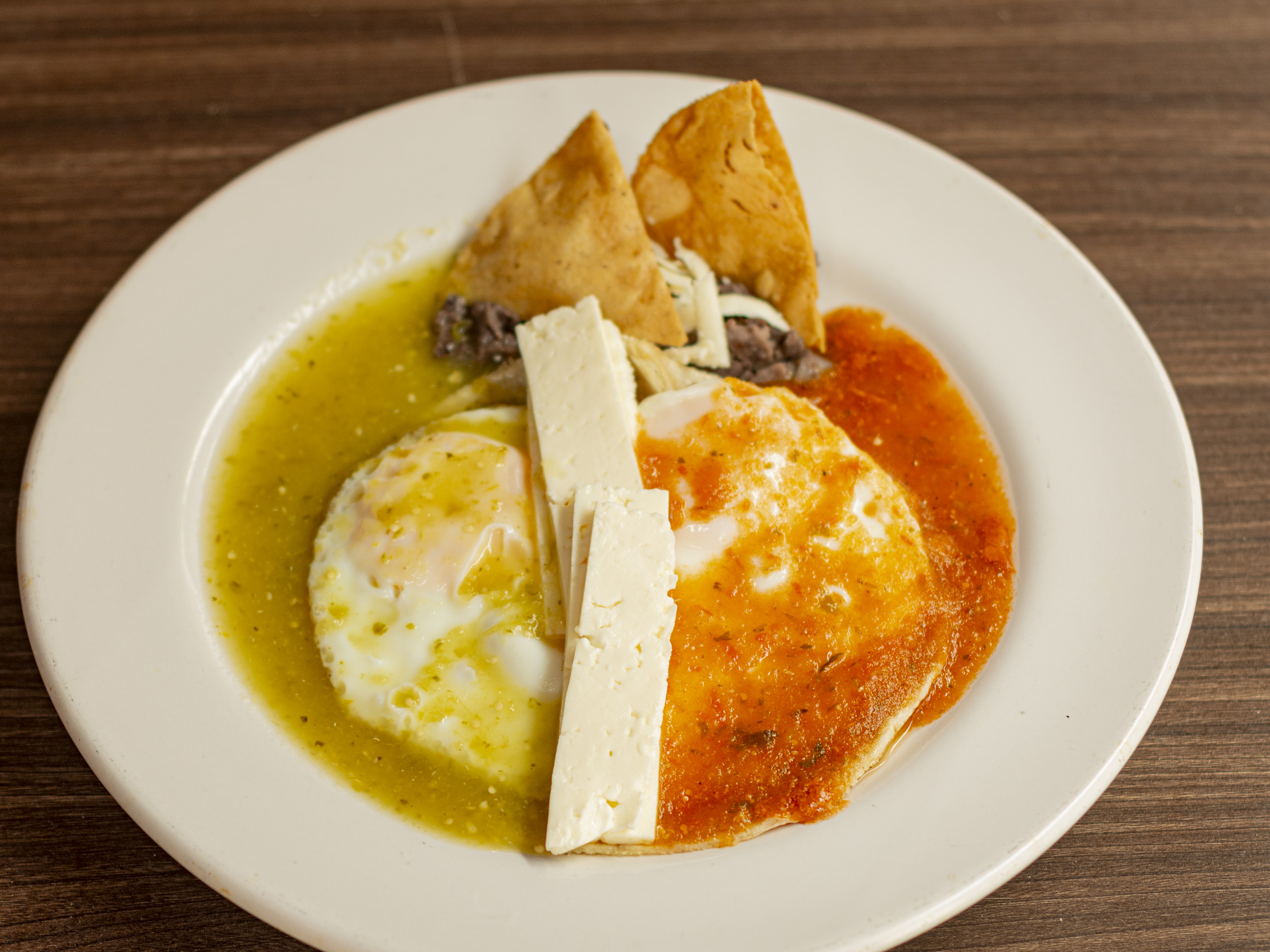 Bañados en salsa roja y salsa verde, con frijolitos, totopos y queso panela.