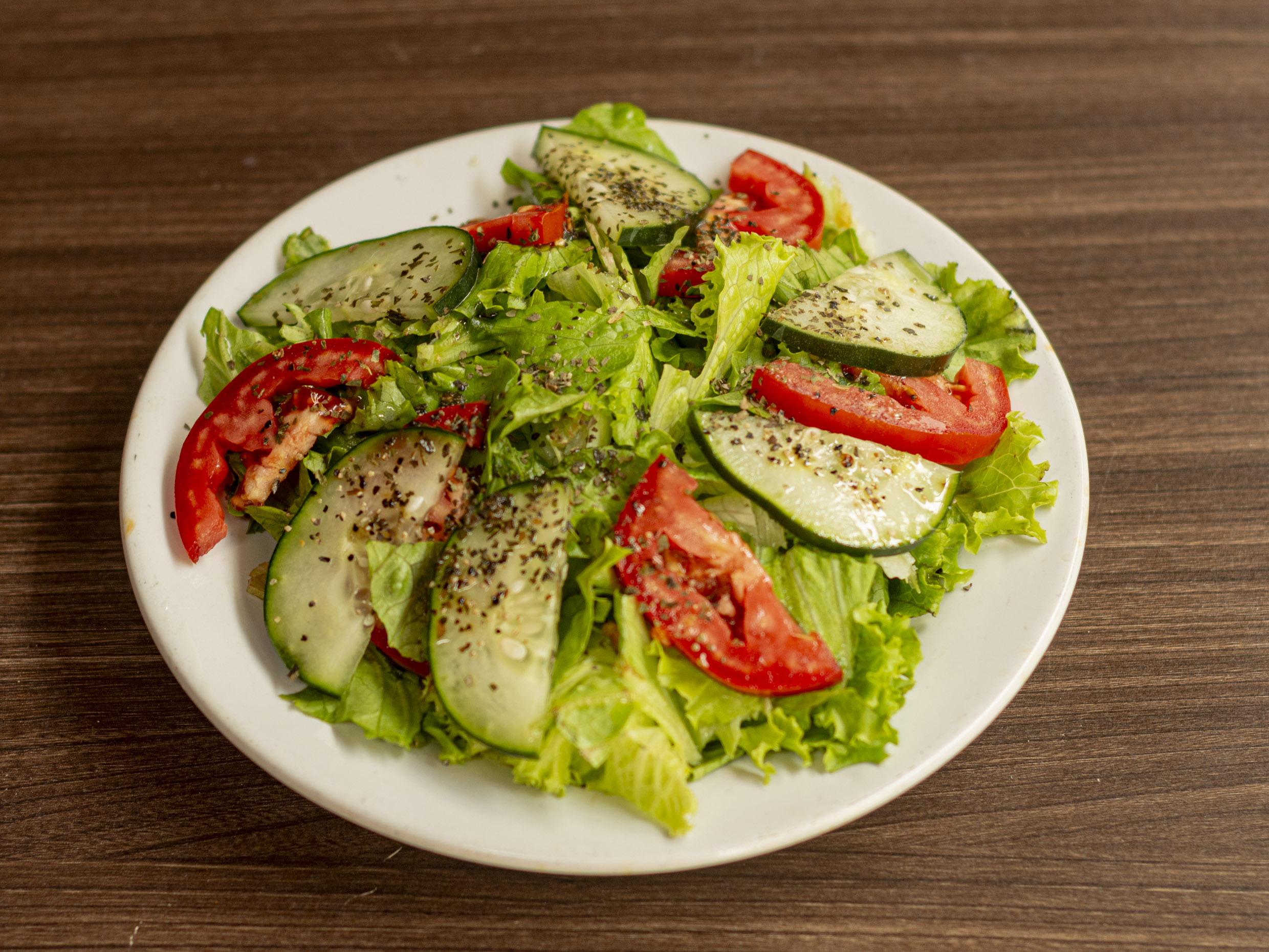 Cama de lechugas con pimientos, uvas, aceitunas, manzana, queso de cabra y aderezo.