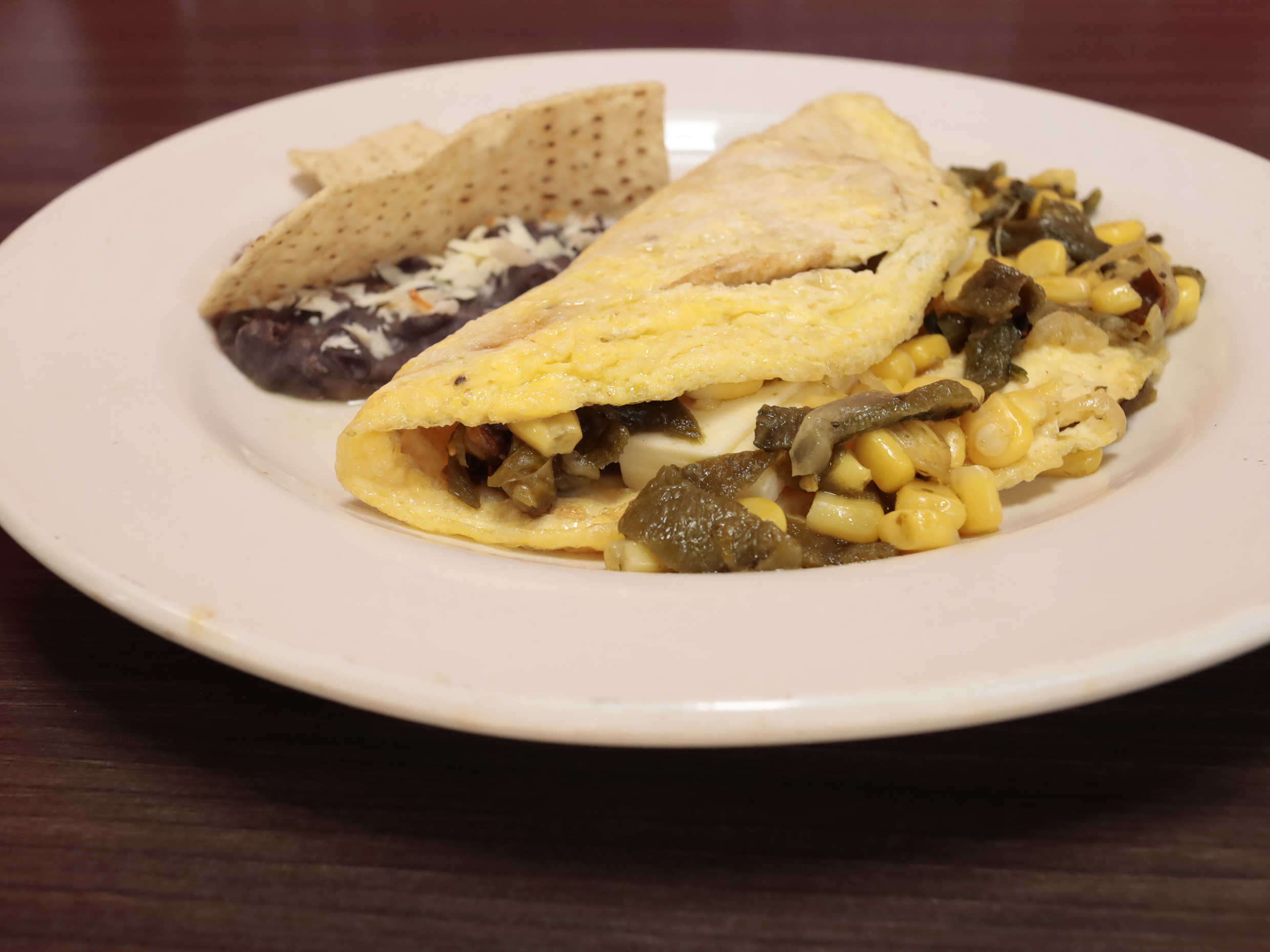 Omelette a elegir de rajas con elote, champiñones con queso, jamón de cerdo con queso suizo, espinacas con queso suizo. tres quesos (cabras, suizo y mozarella) acompañado de frijolitos refritos, bebida y pieza de pan dulce o fruta del día.