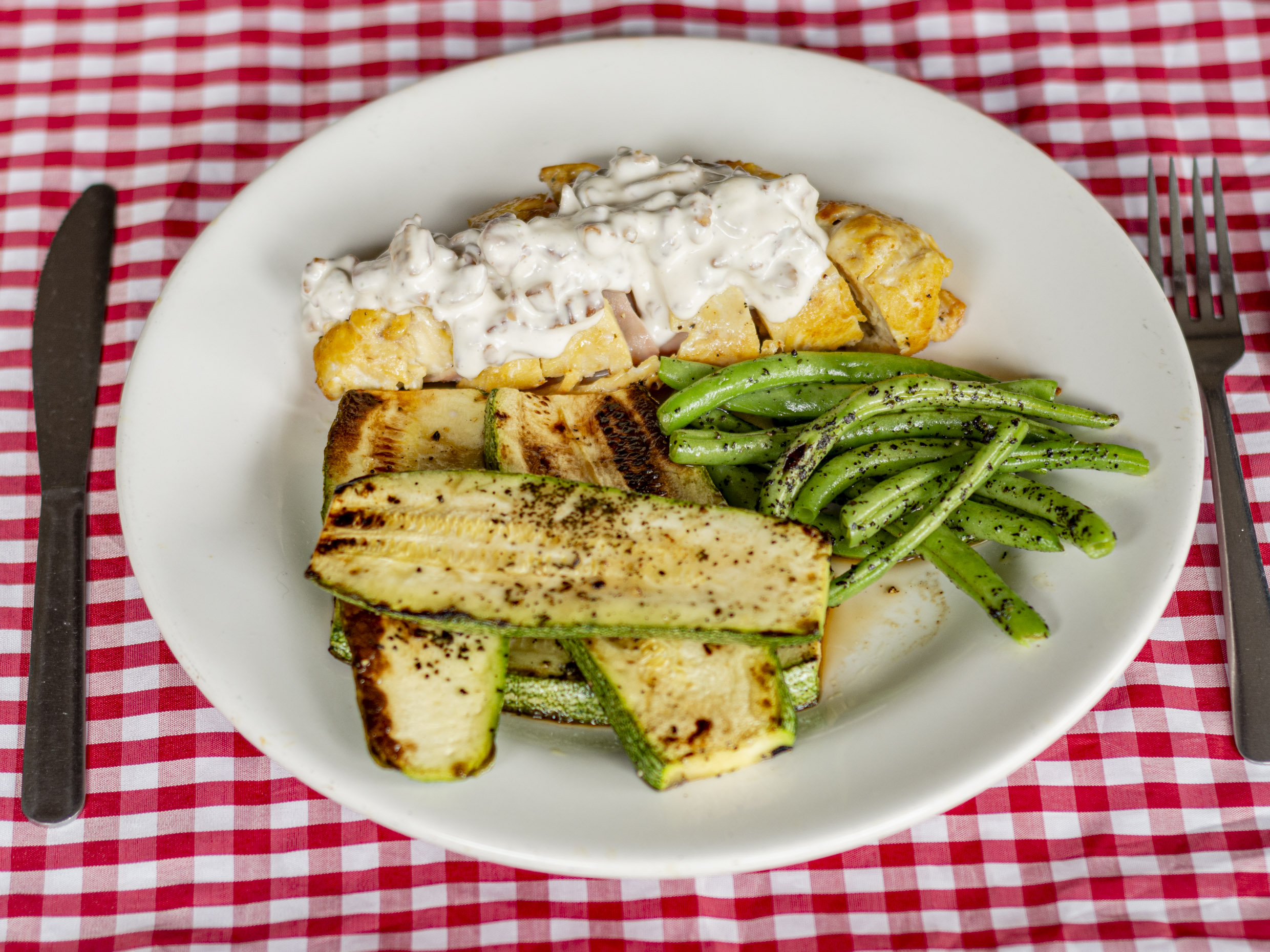200 Gr. de pechuga de pollo rellena de jamón, queso y nuez, con un listón de salsa blanca flameada. Acompañada de verduras a la mantequilla.