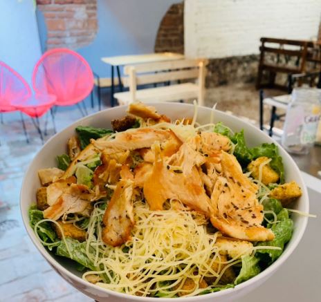 Lechuga con aderezo césar ,queso parmesa, crotones y pollo