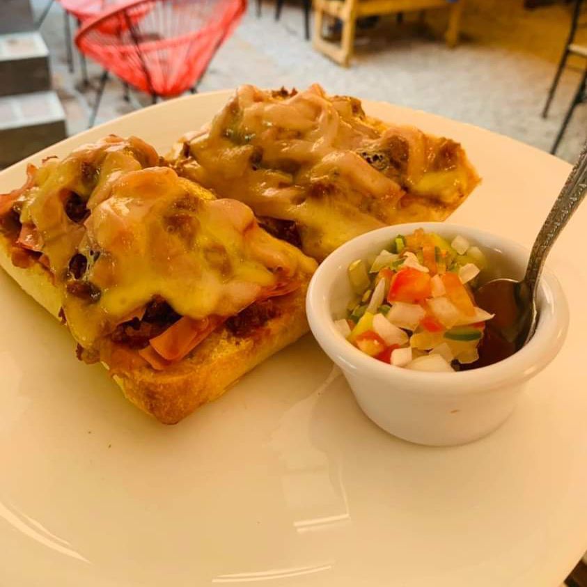 3 piezas de pan con frijoles quesos y tiras de jamon acompañado de pico de gallo