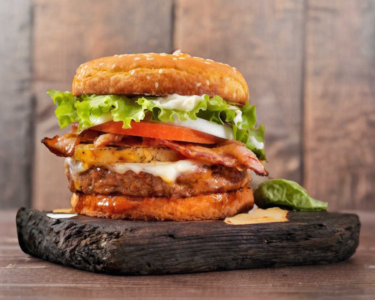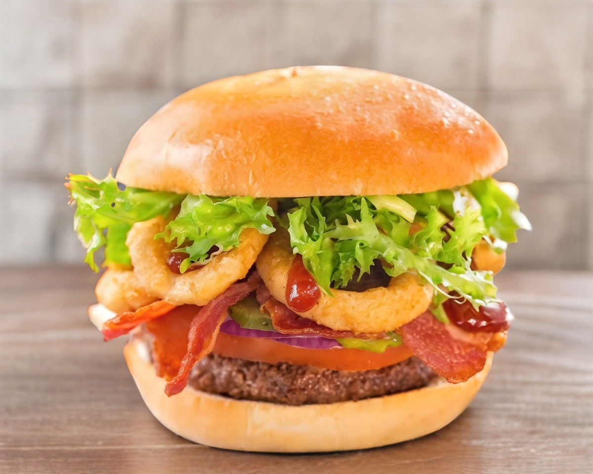 Carne de res 200gr, aros de cebolla, tocino, queso amarillo, queso manchego y verduras.