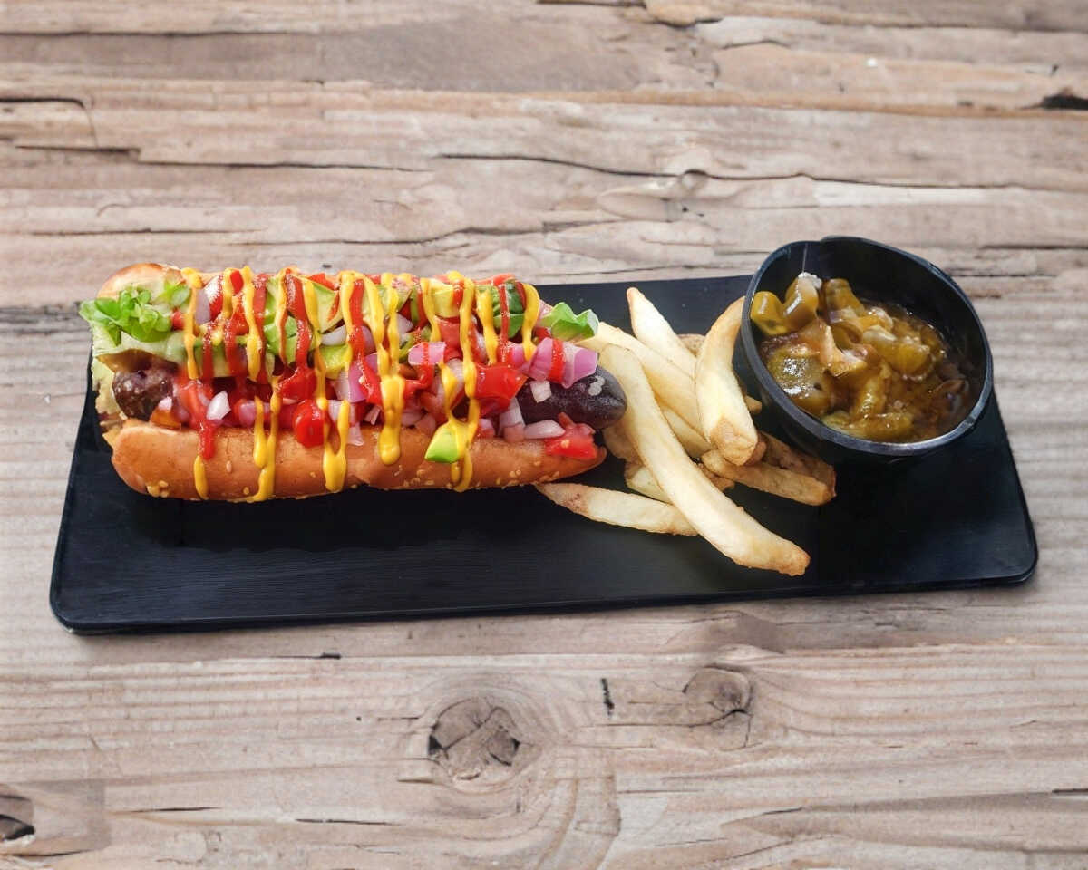 Pan jumbo con salchicha de res con queso manchego gratinado.