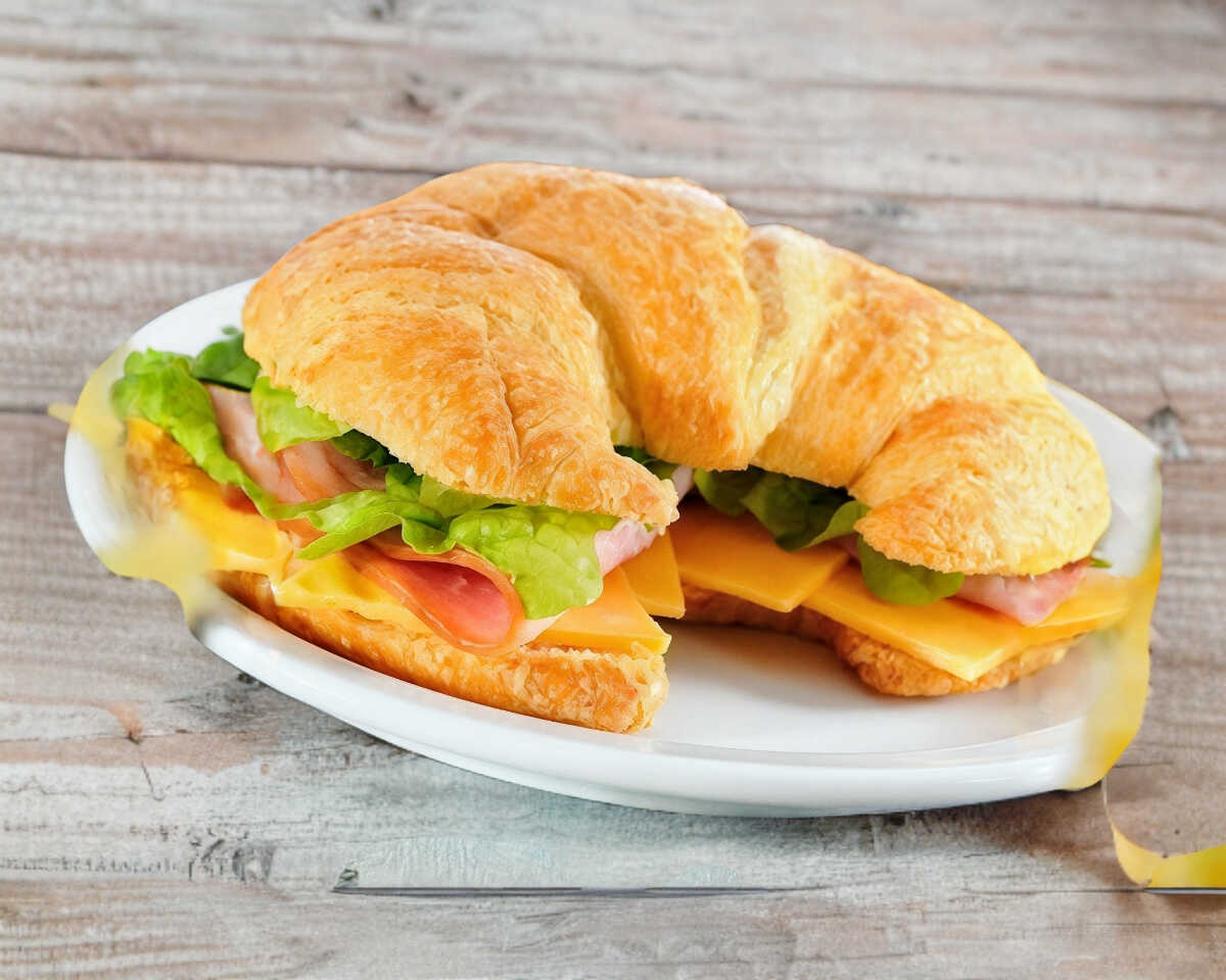Cuernito de jamón de pavo con queso manchego, queso americano y verduras.