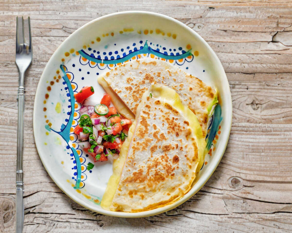 Tres piezas de tortillas de harina completas, jamón de pavo, queso americano y queso manchego, acompañado por pico de gallo.