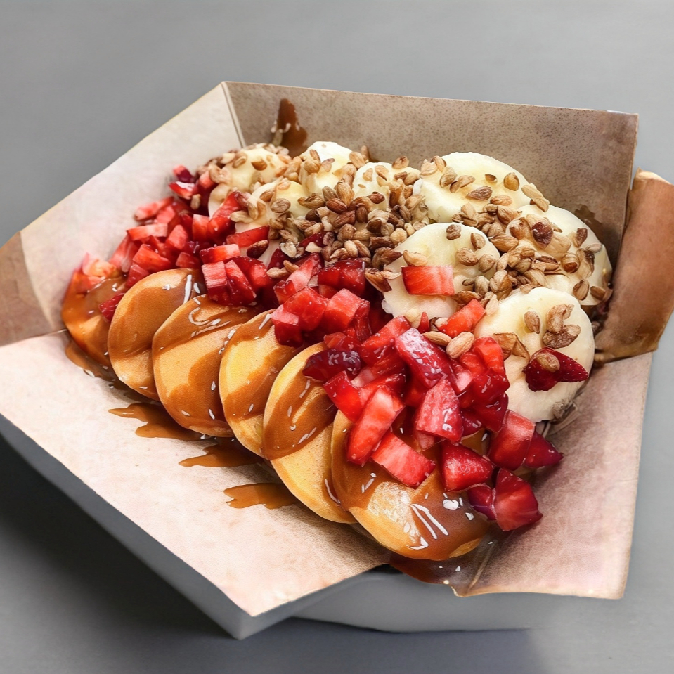 "Pequeños pero deliciosos, nuestros mini hotcakes son la opción perfecta para un desayuno ligero o un antojo dulce. Su textura esponjosa y su sabor suave te conquistarán desde el primer bocado. Acompáñalos con miel de maple, frutas frescas o tu topping favorito."