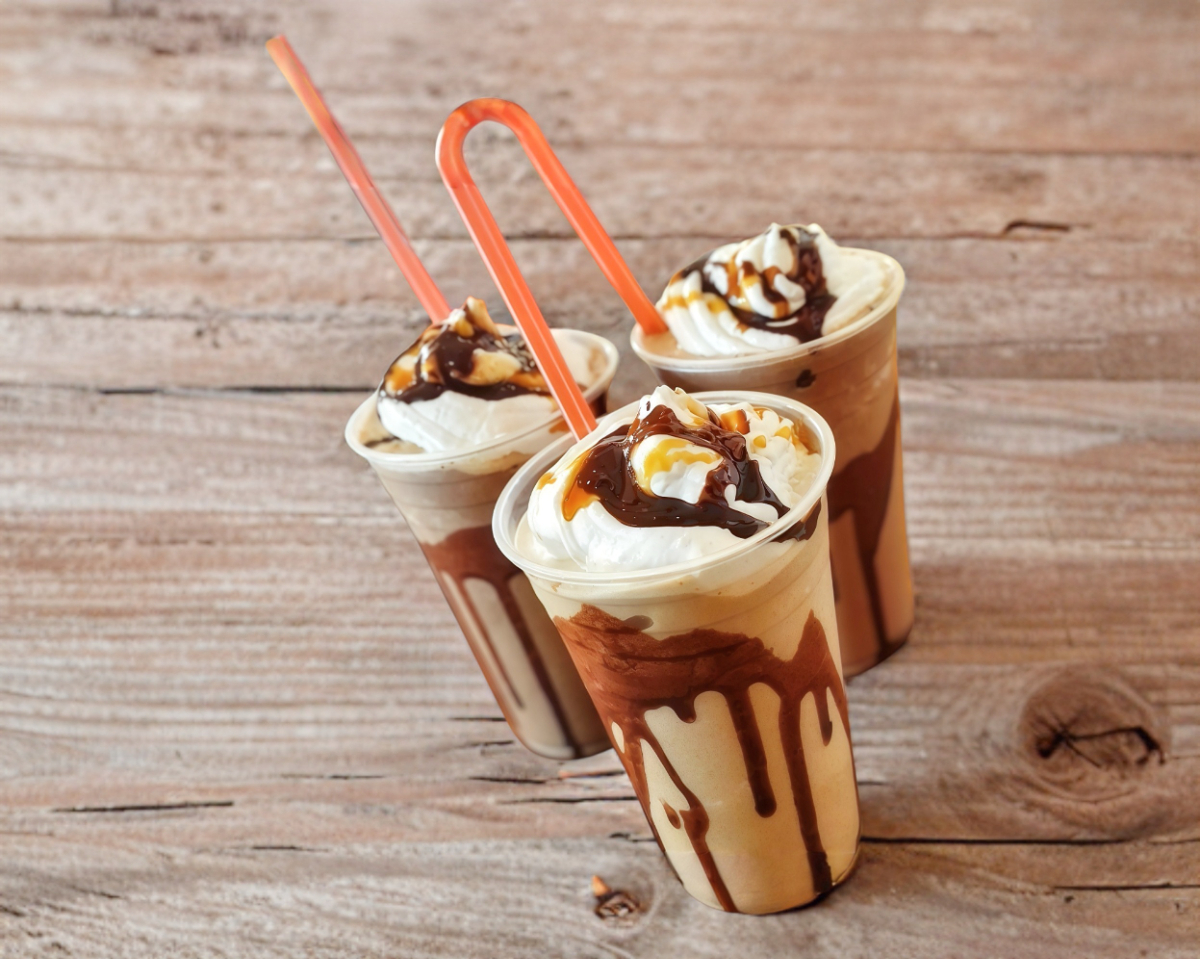 "Un capricho irresistible, nuestro frappé de moka es una combinación deliciosa de café, chocolate y leche. Su sabor dulce y cremoso te hará pecar de gusto. ¡Una verdadera delicia para los más golosos!" Tres frappes de Moka tamaño Grande de 16 onzas