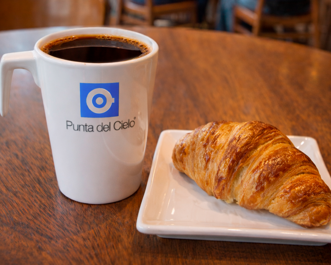 Café Mexicano (16oz) caliente acompañado de croissant recién horneado.
