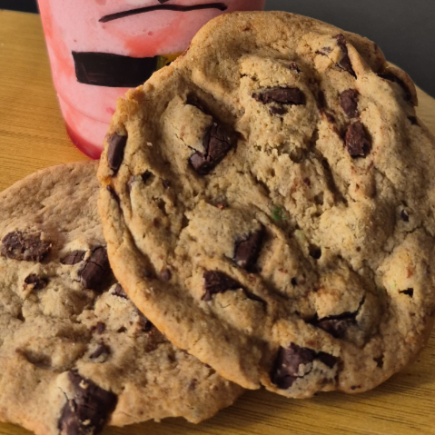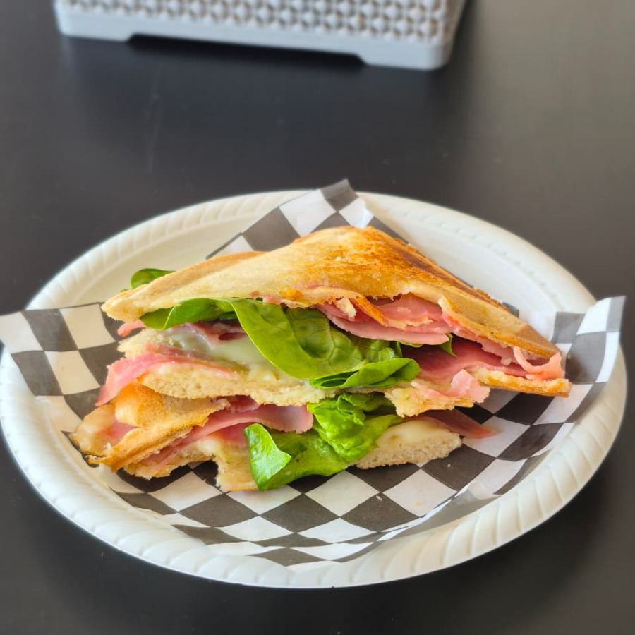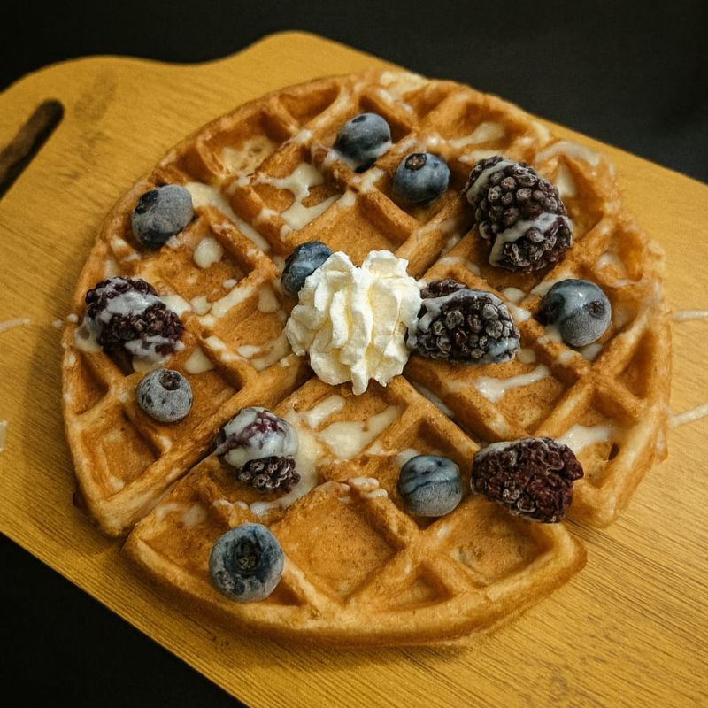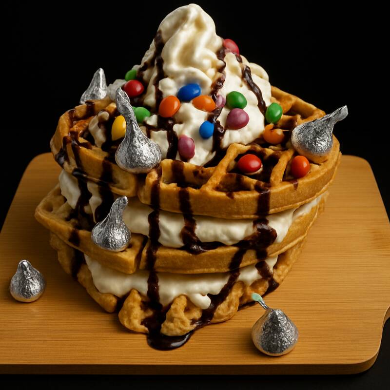 3 waffles deliciosos, con crema batida, M&M's, kisses y jarabe de chocolate