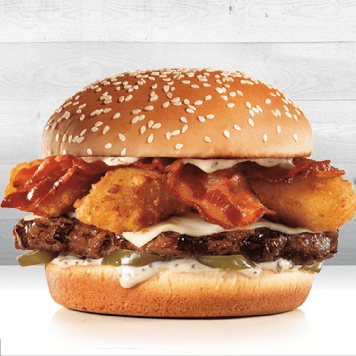 Con carne 100% Black Angus, queso Pepper Jack, tiras de tocino ahumado, aros de cebolla, rodajas de jalapeño y salsa BBQ con un toquesito picante. Servida en pan premium.