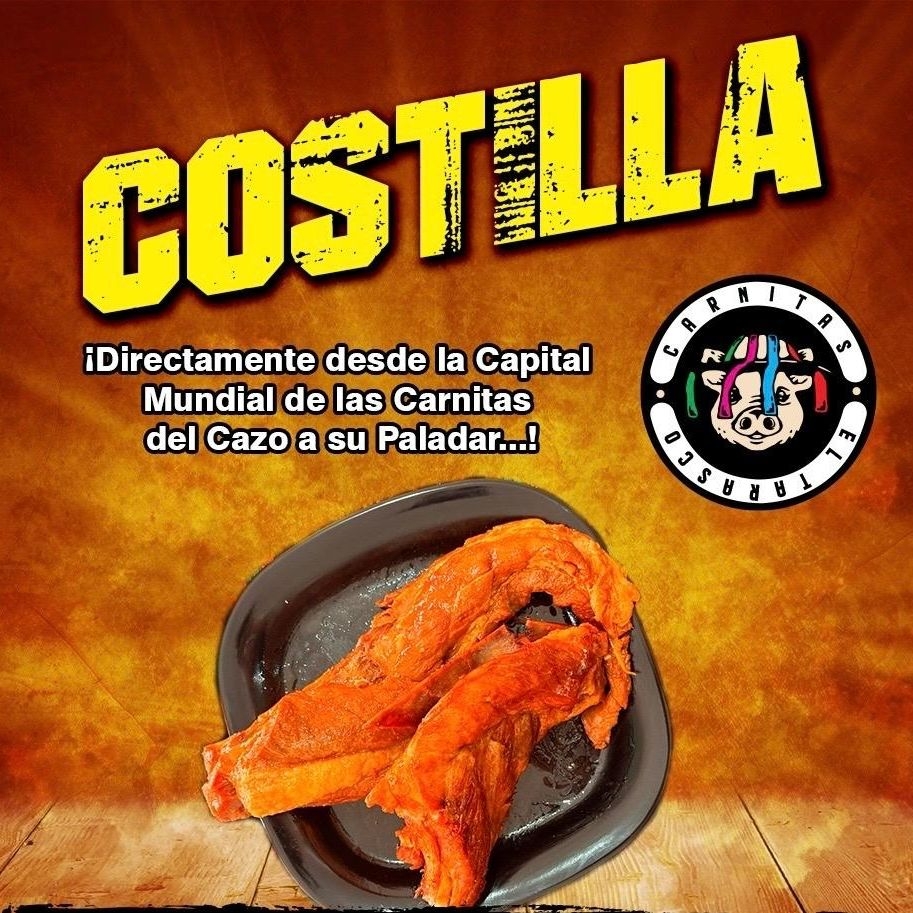 Pieza entera de costilla estilo carnitas, enviadas con cebolla, cilantro, limón, salsa verde, salsa roja, cebolla con habanero y piña.
