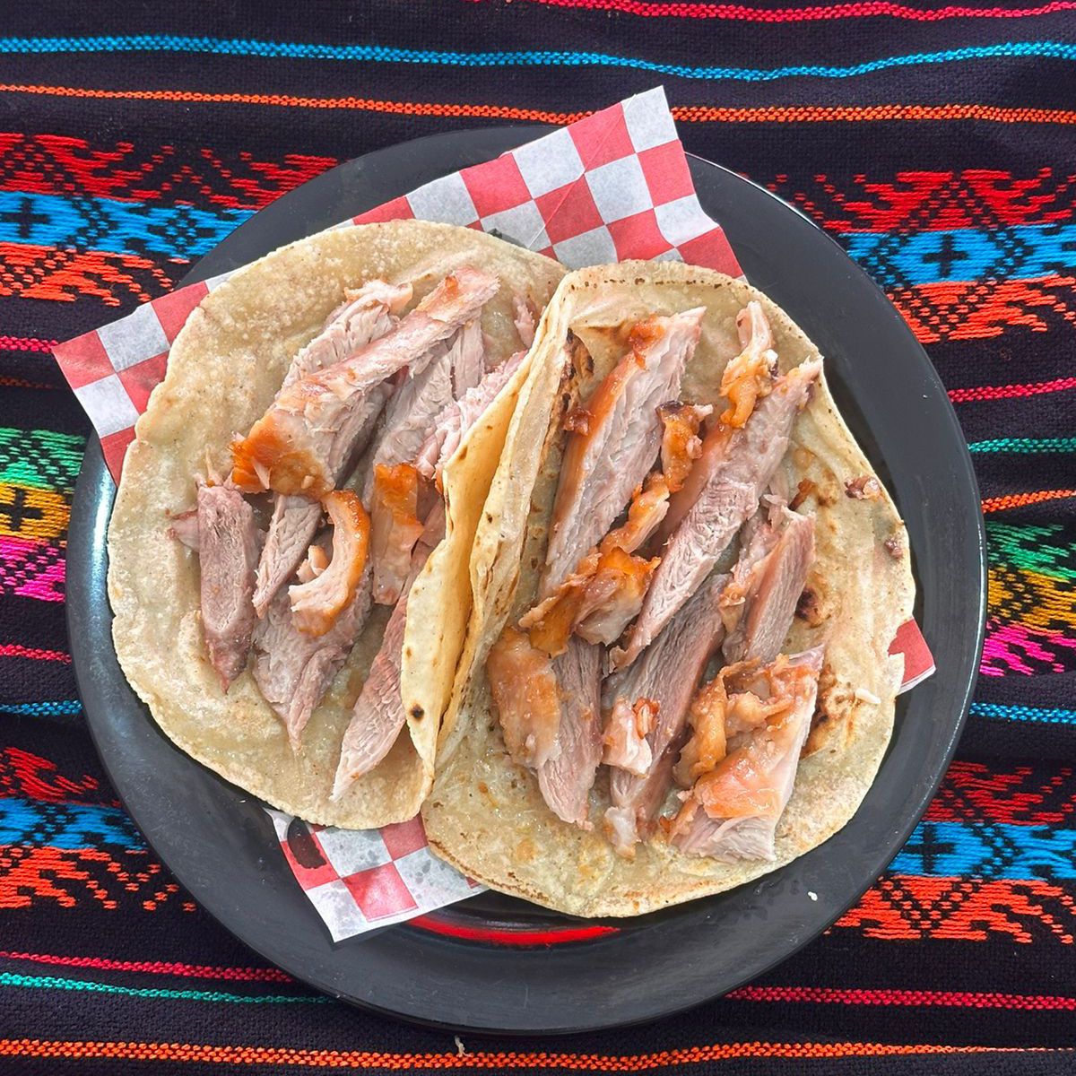 Taco con tortilla hecha a mano, carne de maciza y guarniciones tradicionales.
