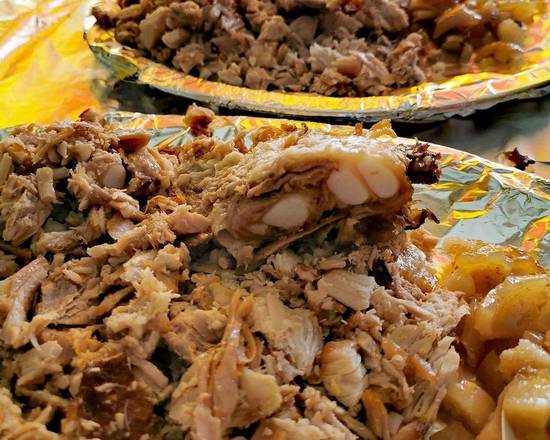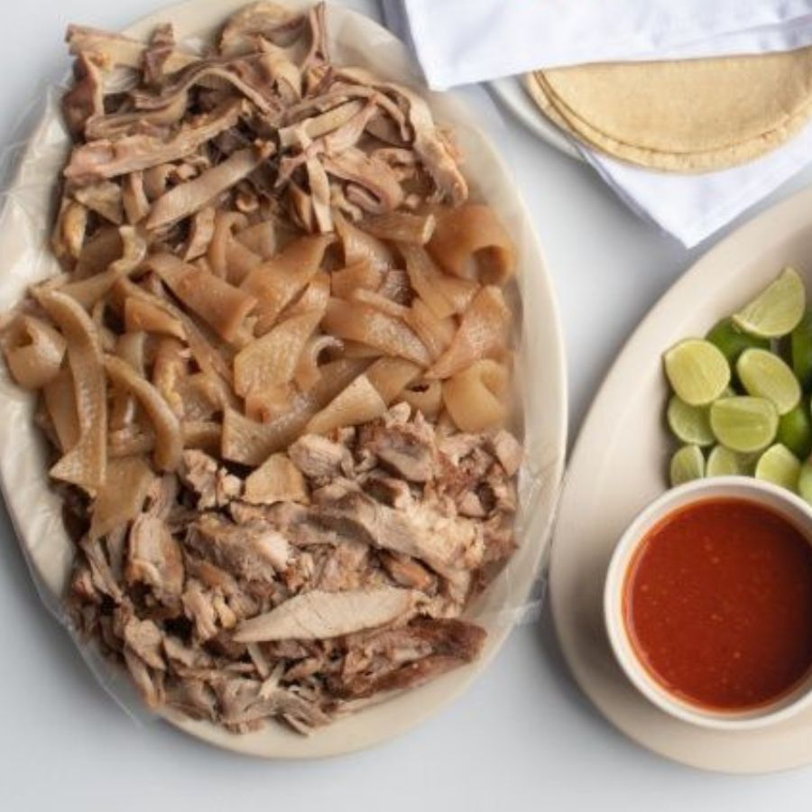 1 kg de carnitas preparado y bien picado, dividido en charola de medio incluye maciza, cosquilla, espaldilla ,chamorro y cuero con sus respectivas guarniciones.