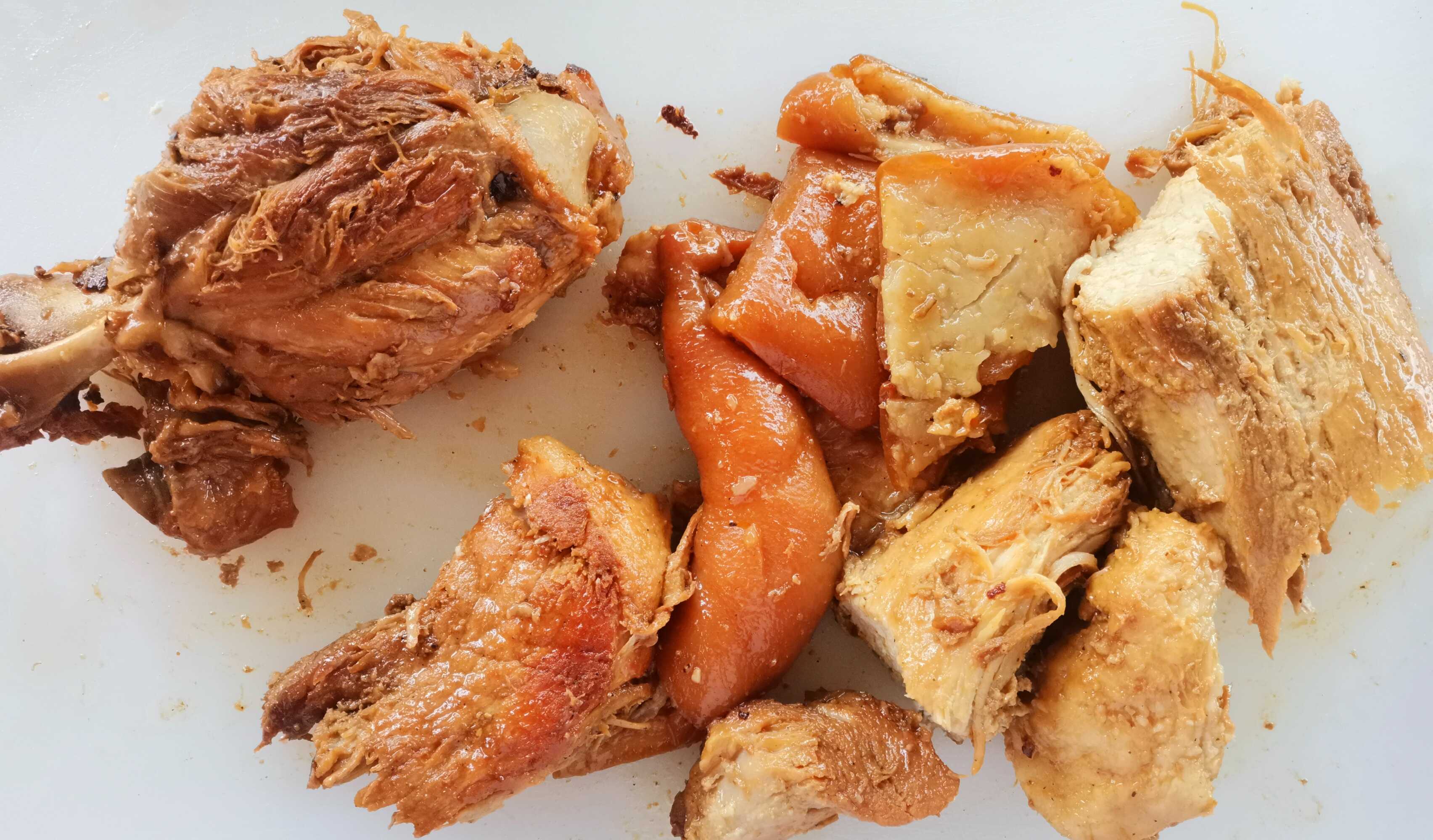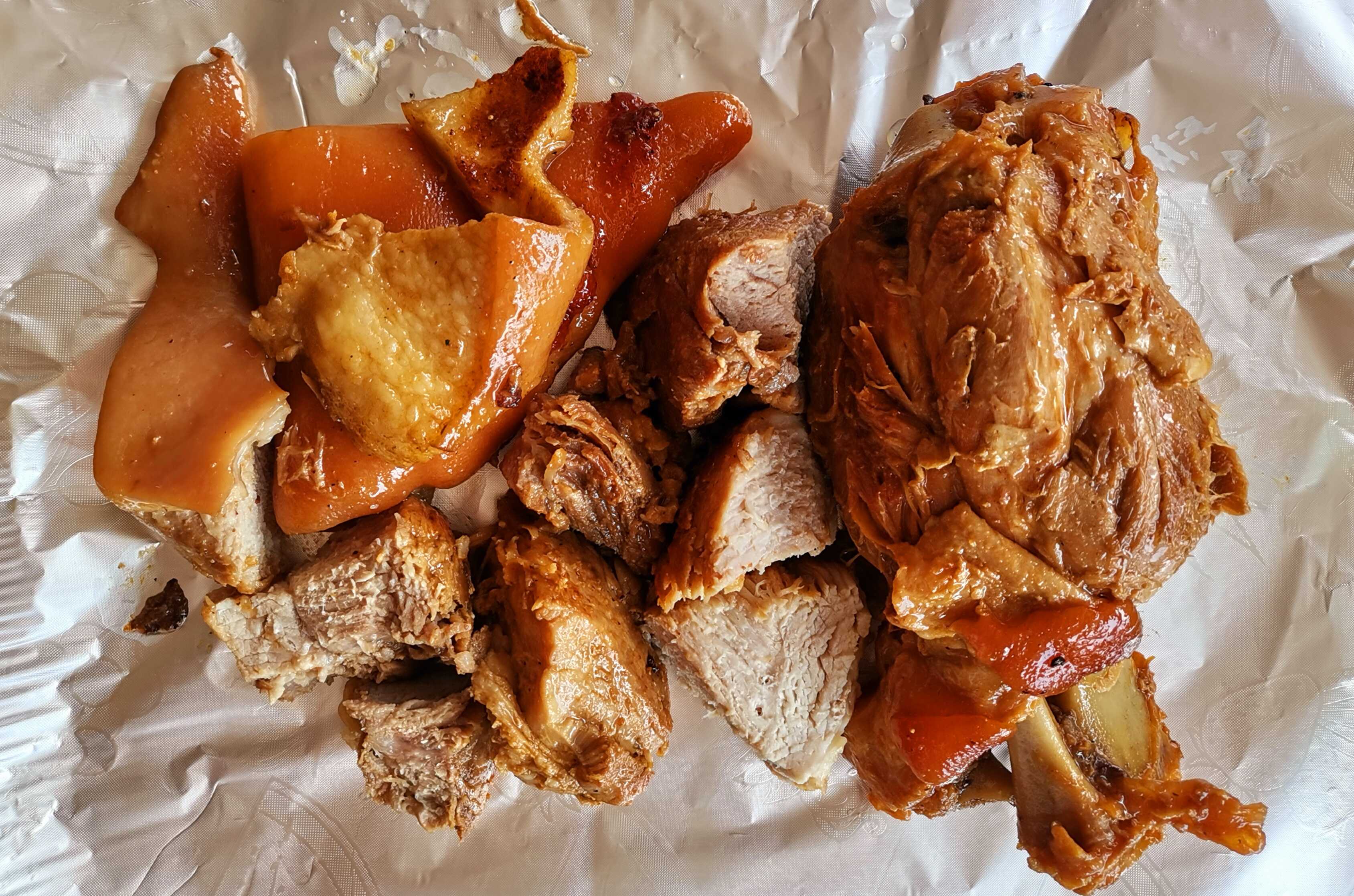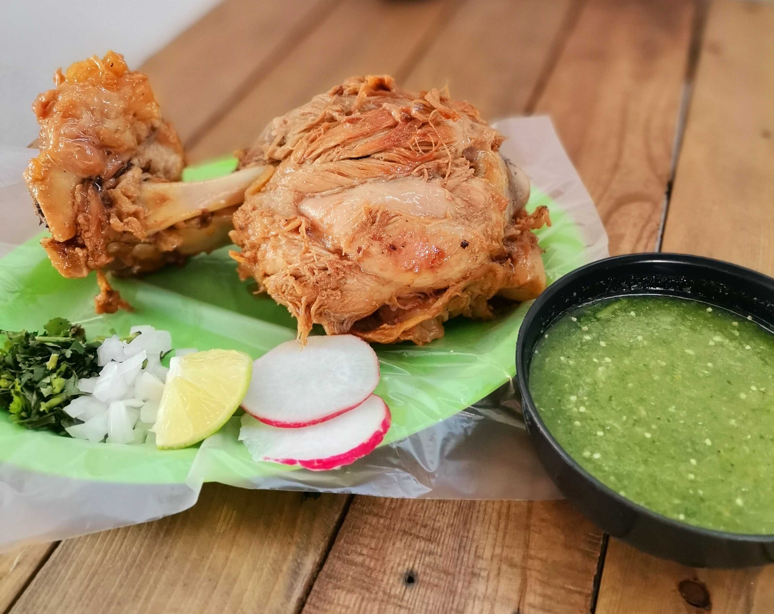 Incluye un chamorro entero, salsa, rábanos y limones, cebolla, cilantro, cebollas moradas con habanero