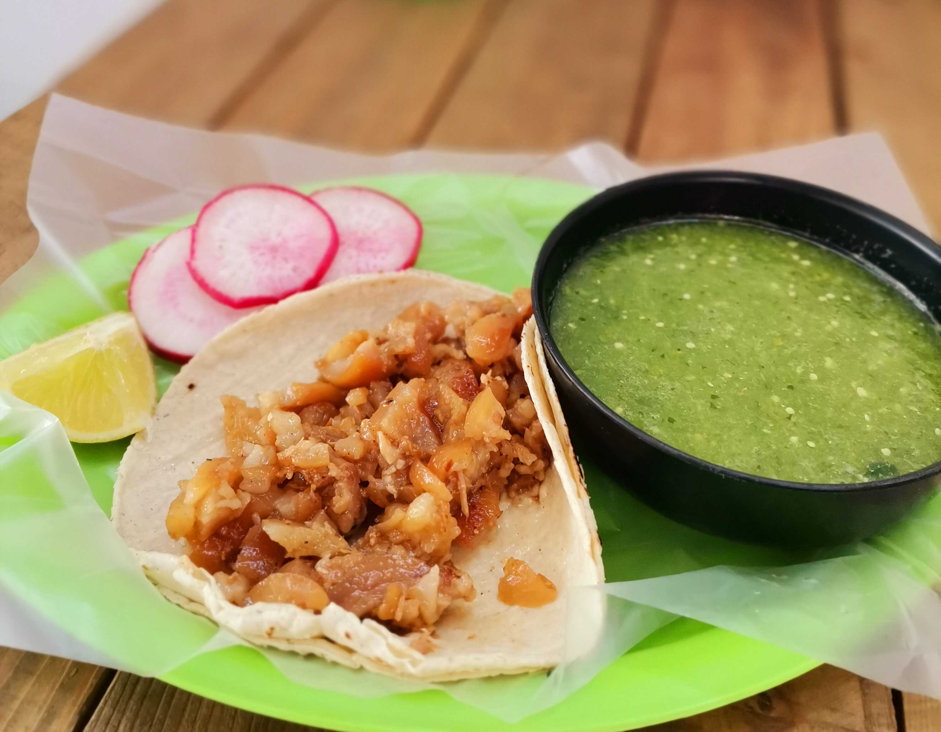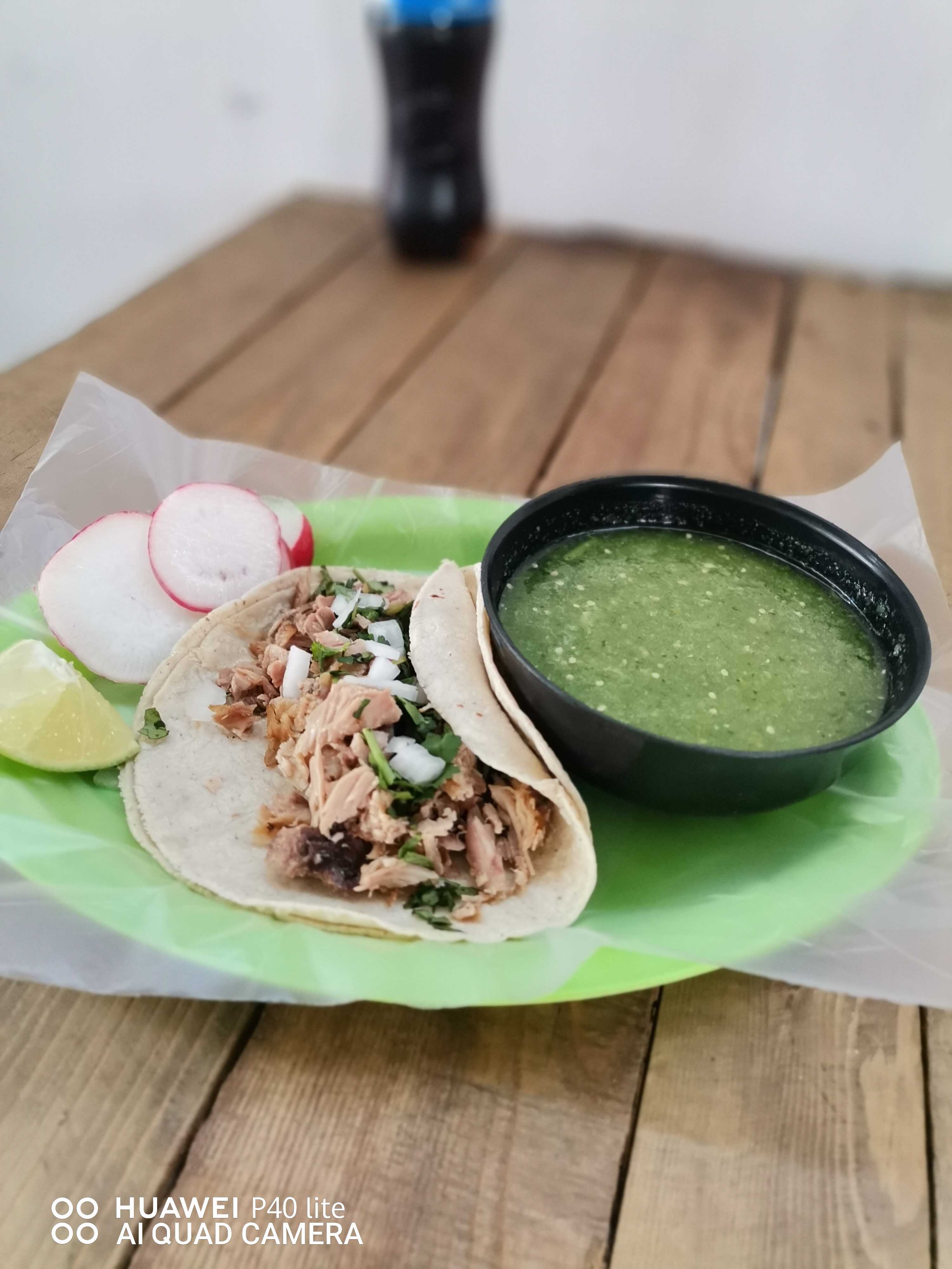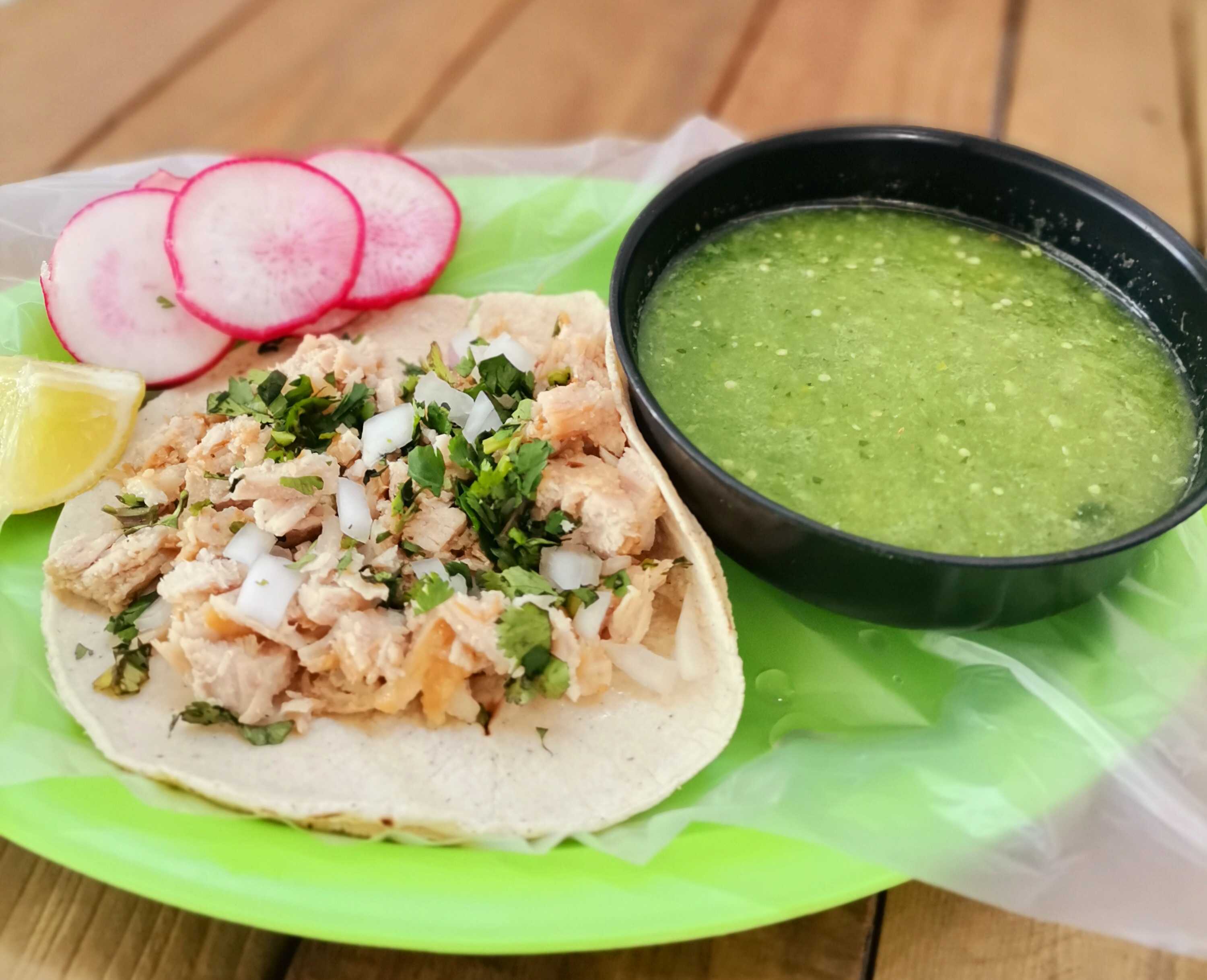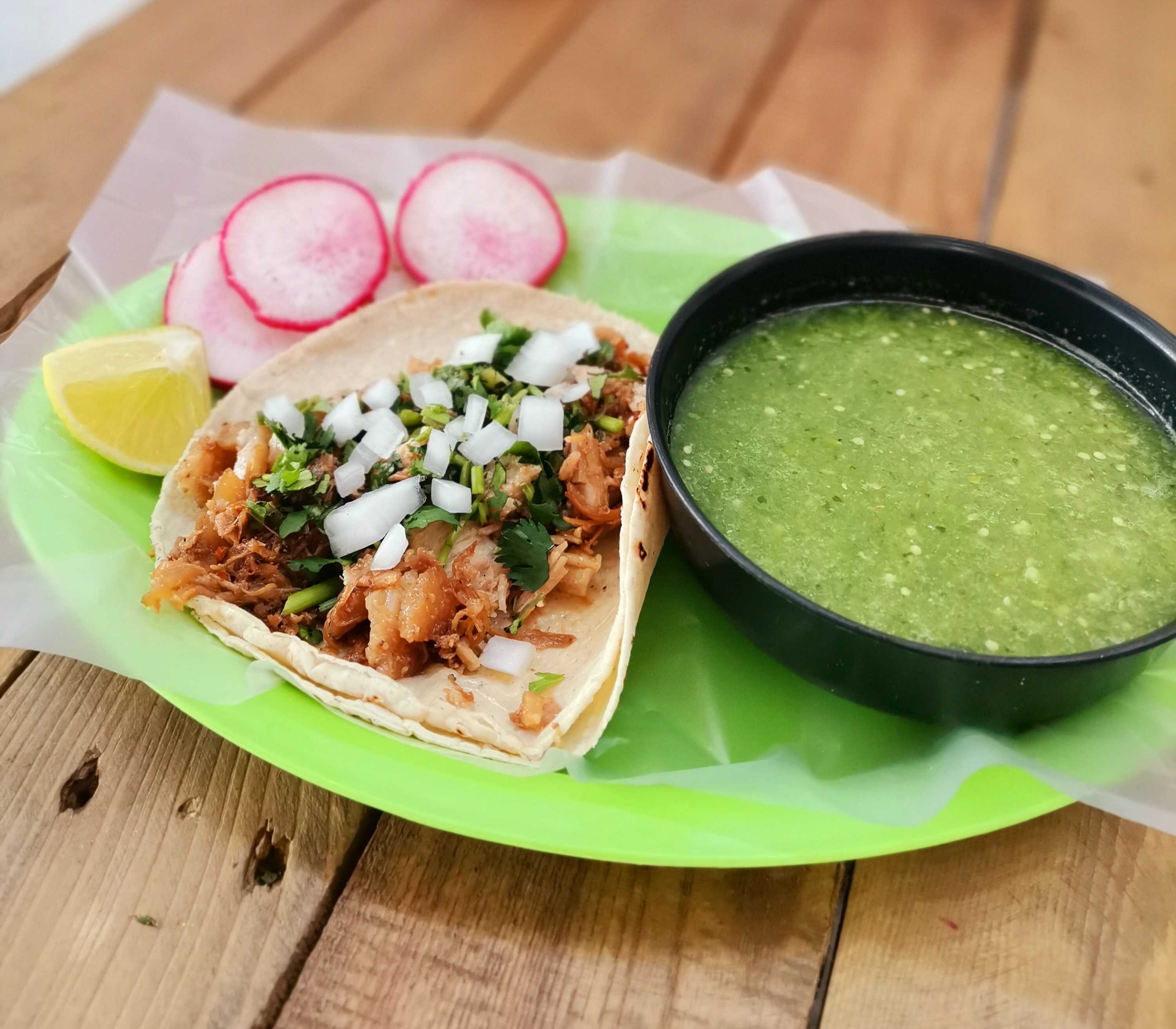 Incluye 1/2 K de carnitas, salsa verde, rábanos, limones, cebolla, cilantro, cebollas moradas con habanero y piña y tacos dorados