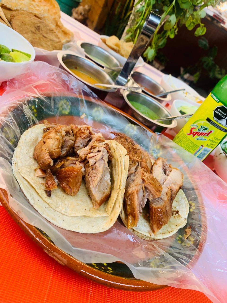 1 Kg de nuestras deliciosas carnitas estilo Guanajuato, incluye salsas, refresco de 2 litros y tortillas