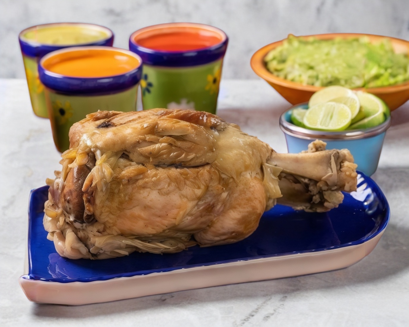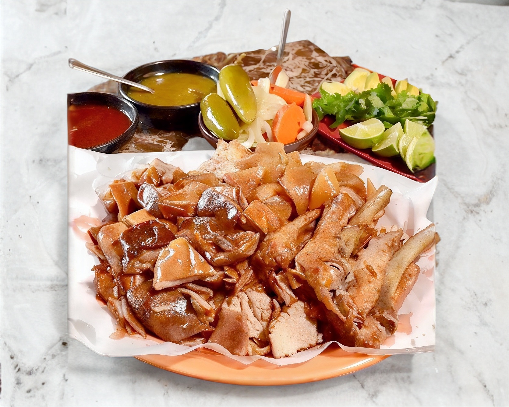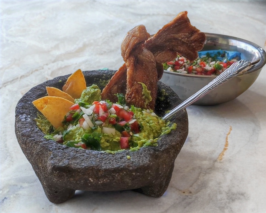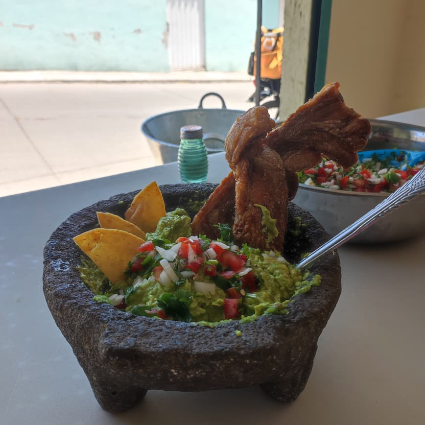 Cuarto de chicharrón norteño, porción de guacamole, complementos y tortillas