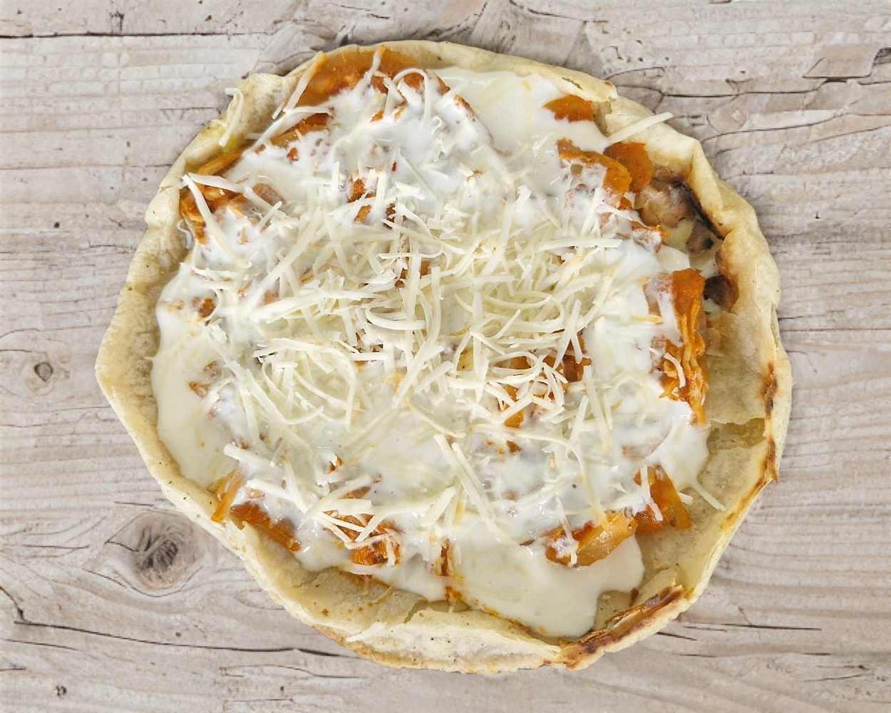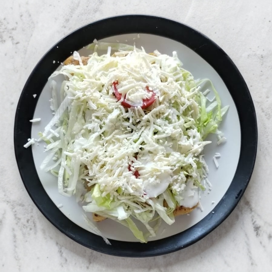 Tostada de maíz con guiso de tinga y acompañada de lechuga, crema y queso.