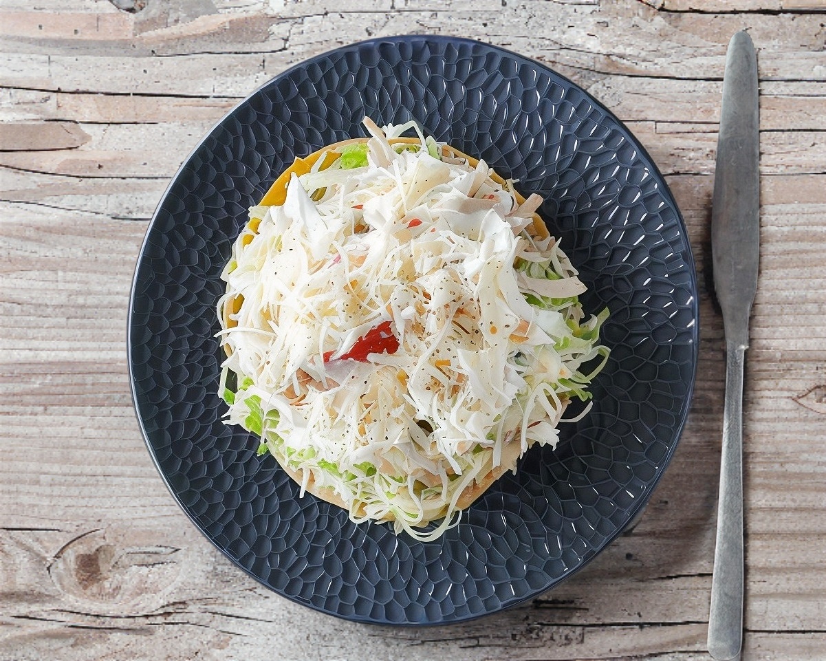 Tostada de maíz con carne deshebrada de puerco y acompañada de lechuga, crema y queso.