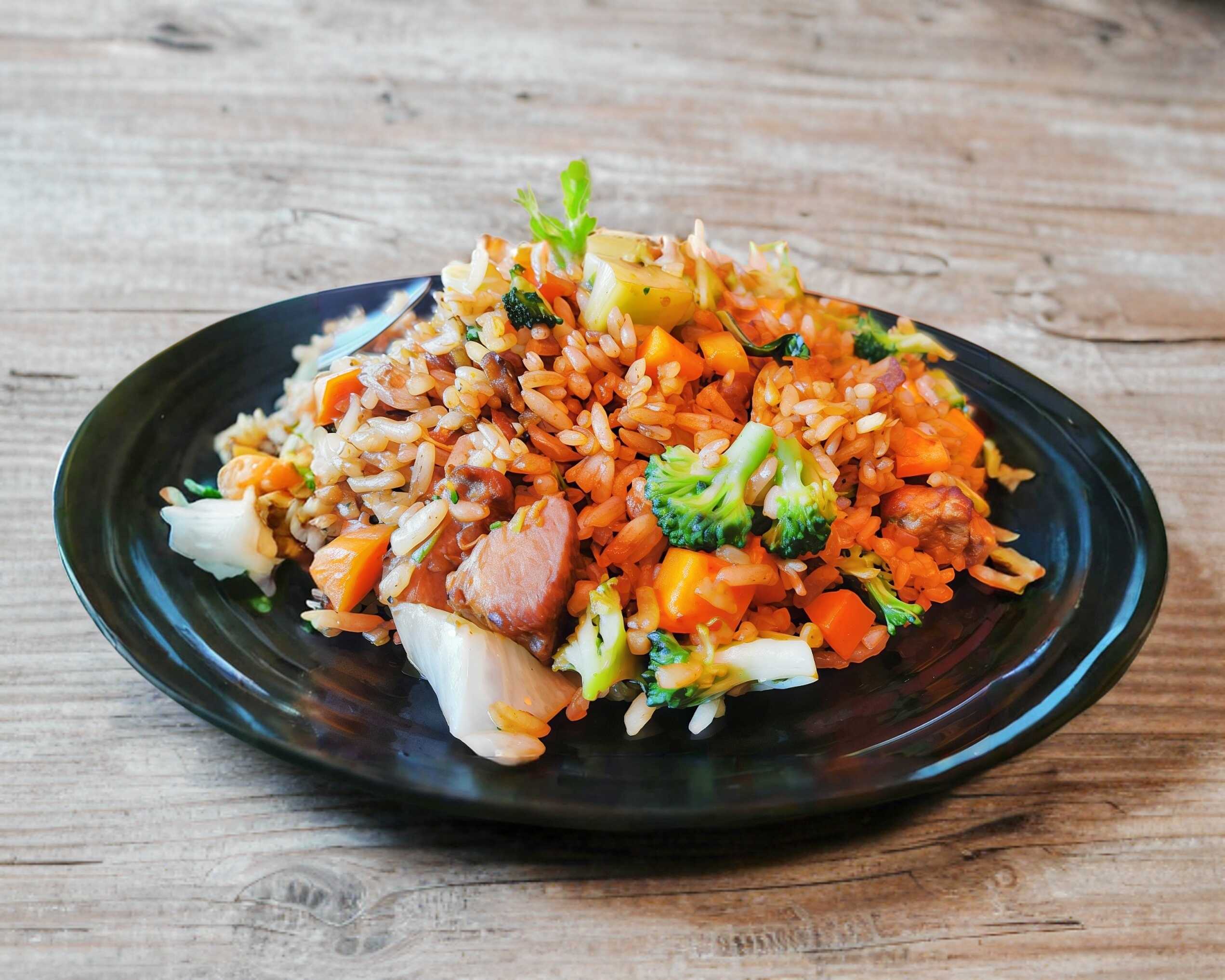 Arroz con verduras acompañado con trozos de res y brócoli en salsa agripicante
