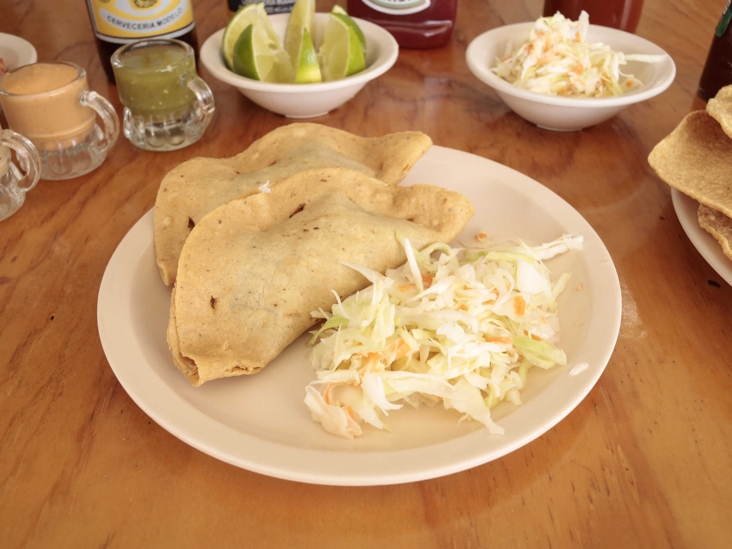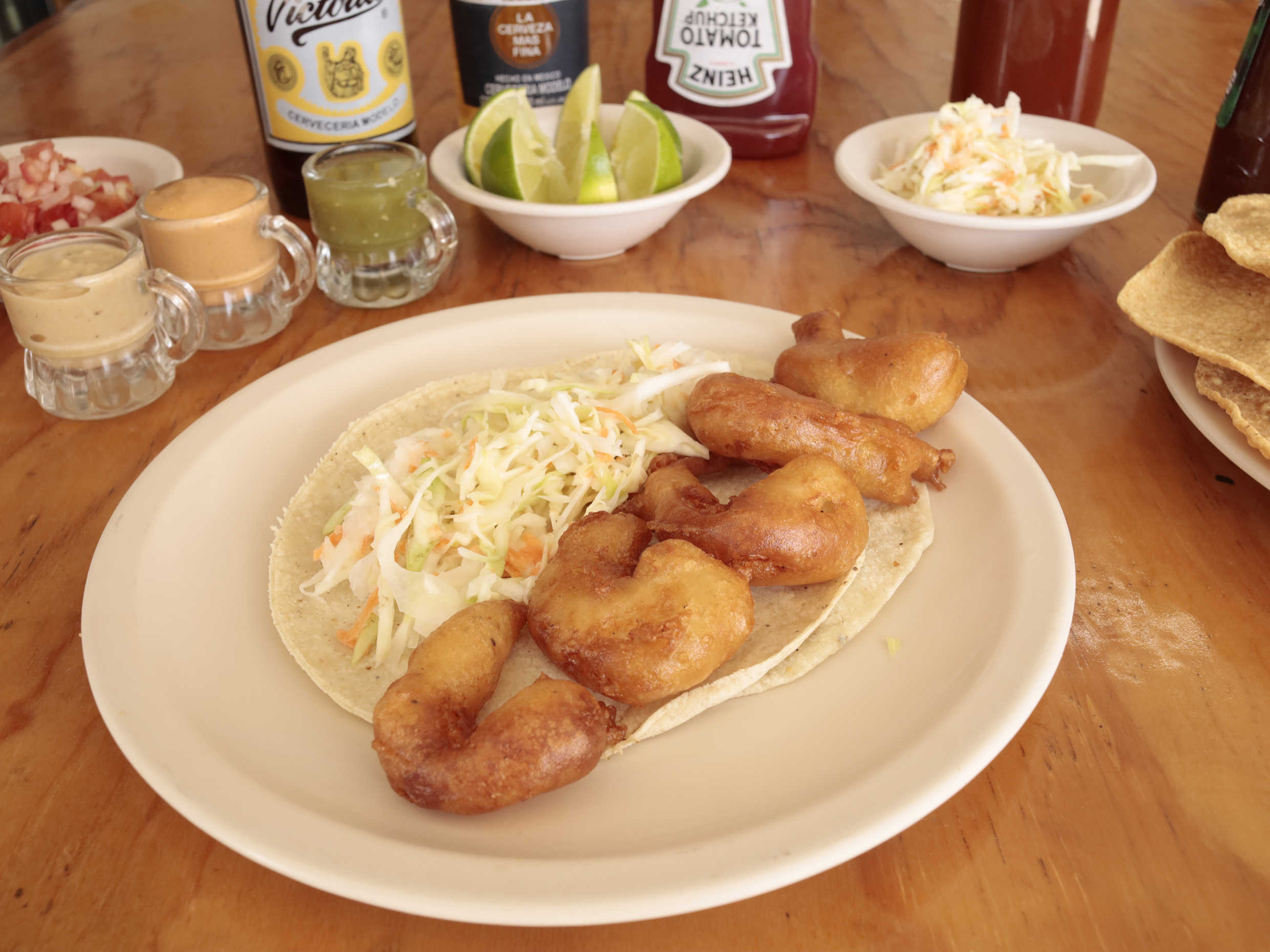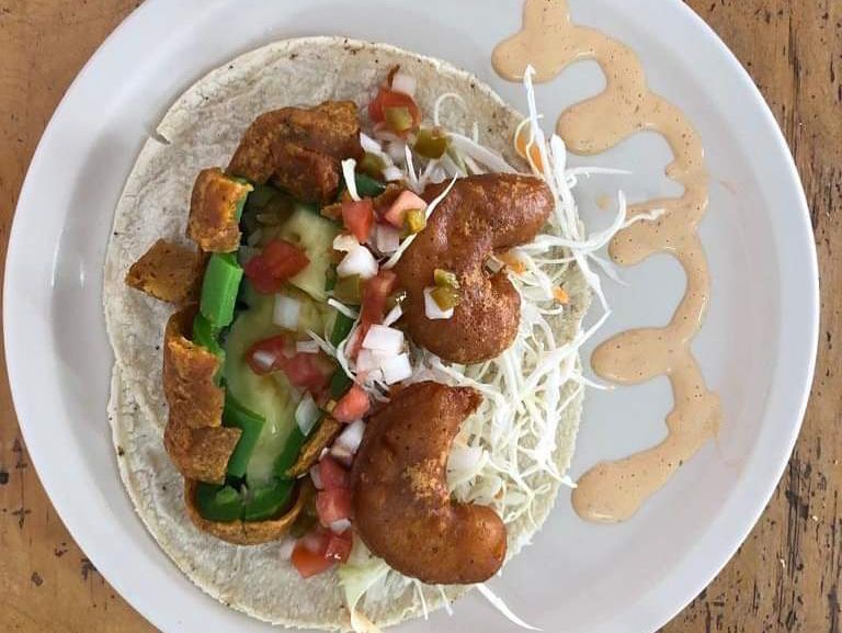 Taco de camarón capeado en tortilla de maíz.