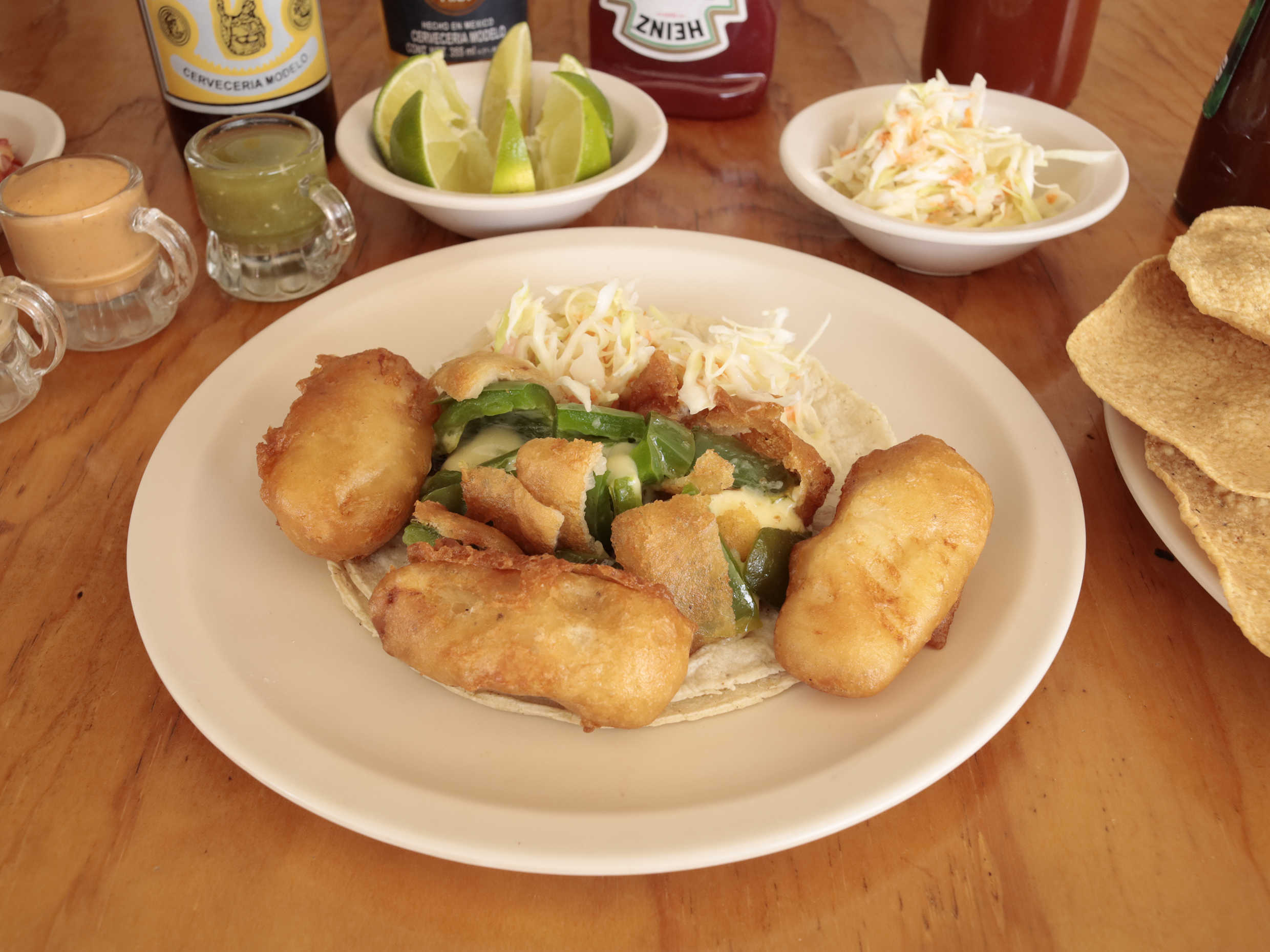 Taco de pescado acompañado con un chile jalapeño relleno de queso gratinado capeado.