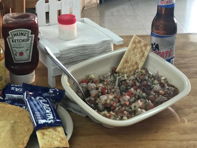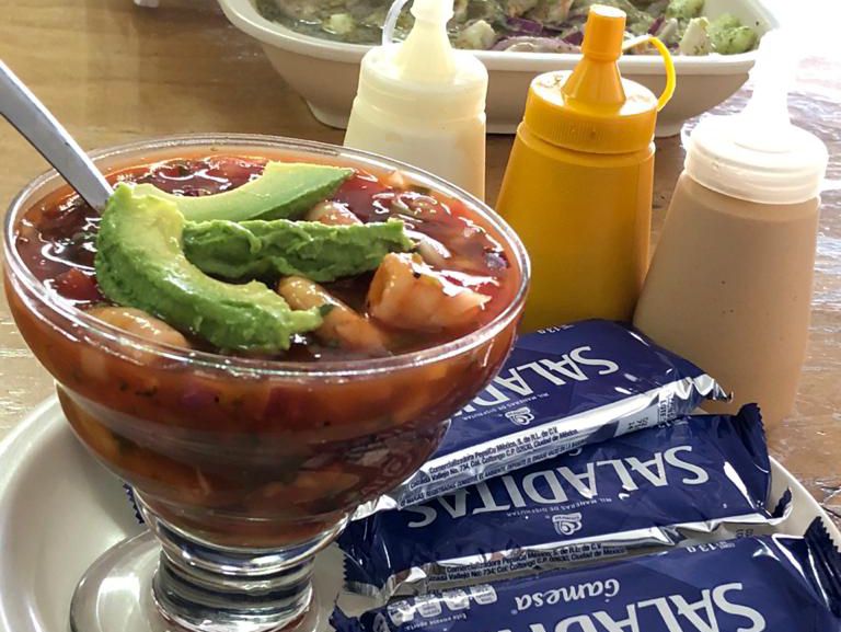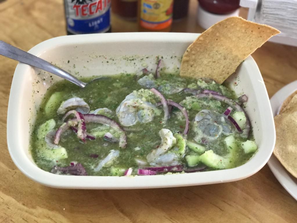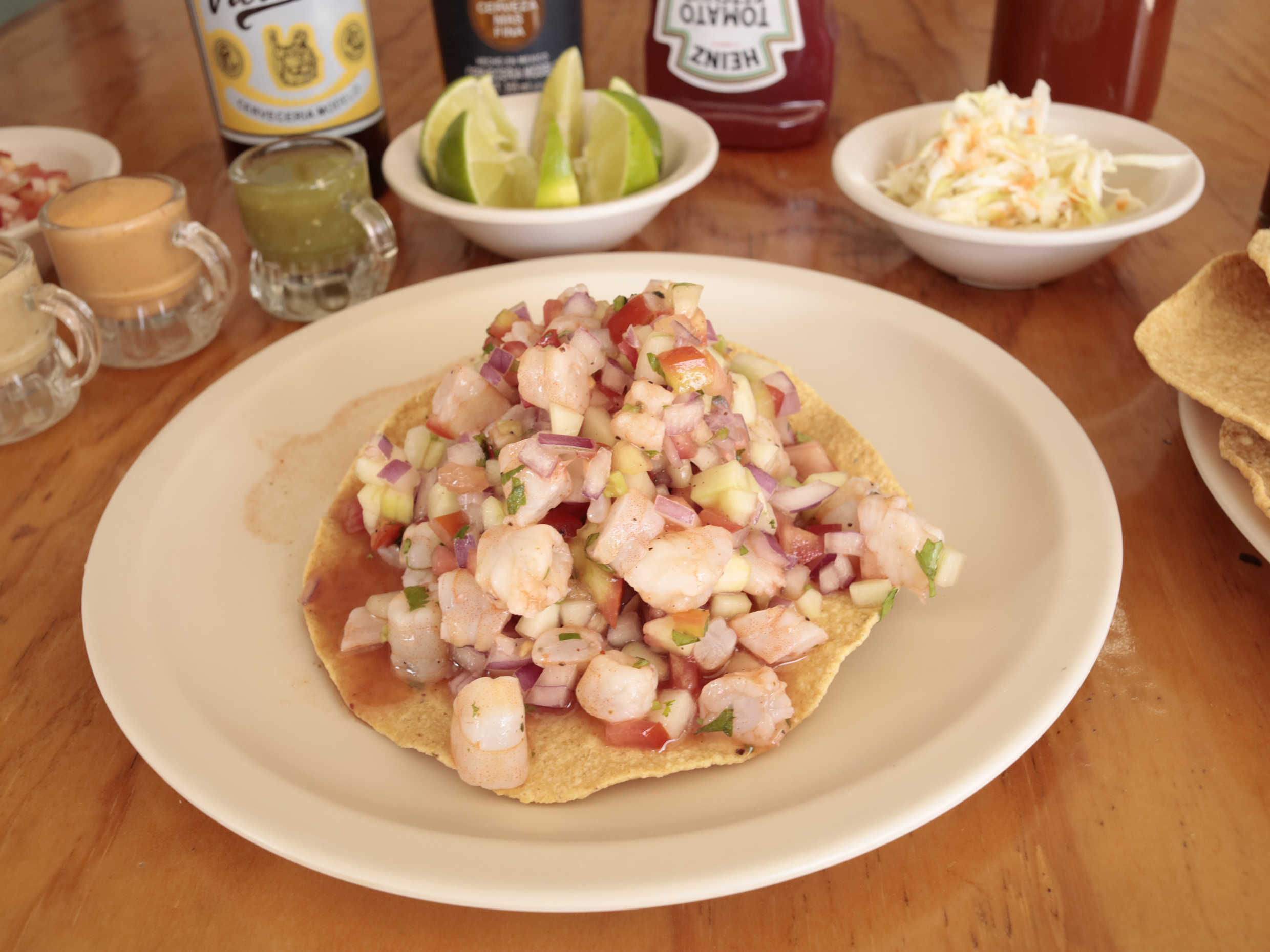 Tostada de ceviche de camarón estilo sinaloense.