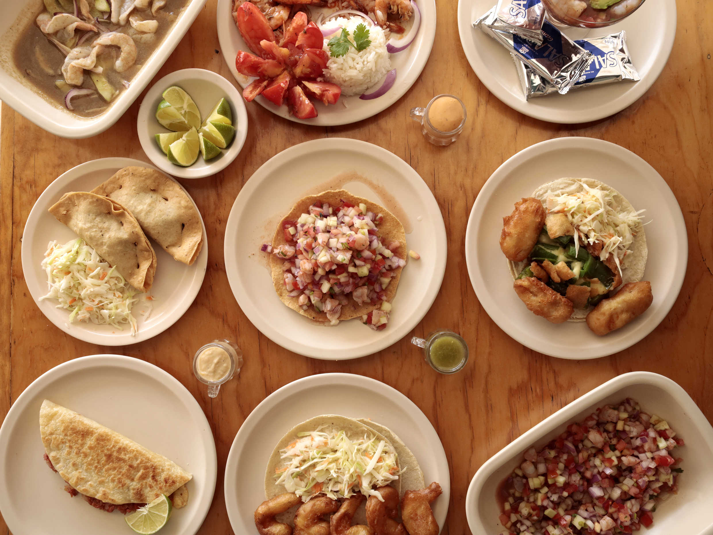 En tortilla de harina con queso gratinado tipo Chihuahua, con camarón y pescado capeado.