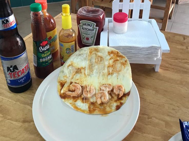 En tortilla de harina con queso gratinado tipo Chihuahua, con camarones capeados.