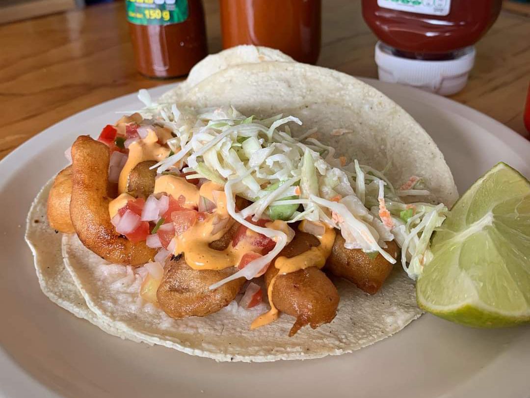 Taco de pescado y camarón capeado en tortilla de maíz.