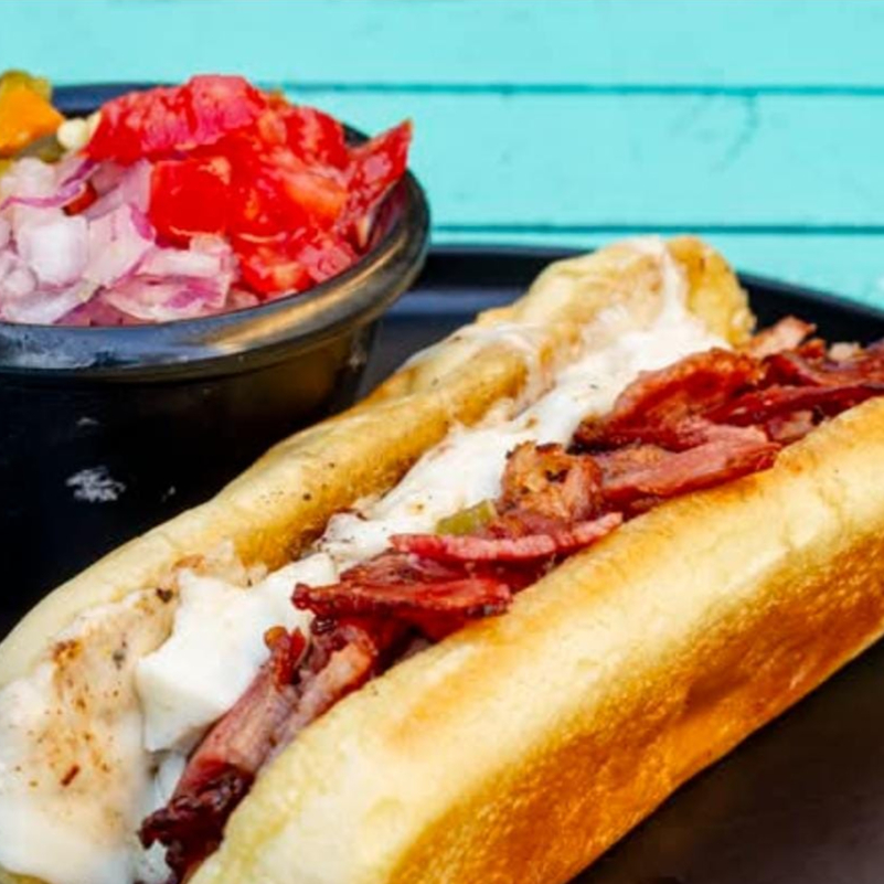 Pan suave estilo americano con salchicha de gran sabor, tocino crujiente, quesito oaxaca derretido, cebolla morada picada, jalapeños, cátsup y mostaza (opcional). Una opción deliciosa y lista para quitarte el antojo.