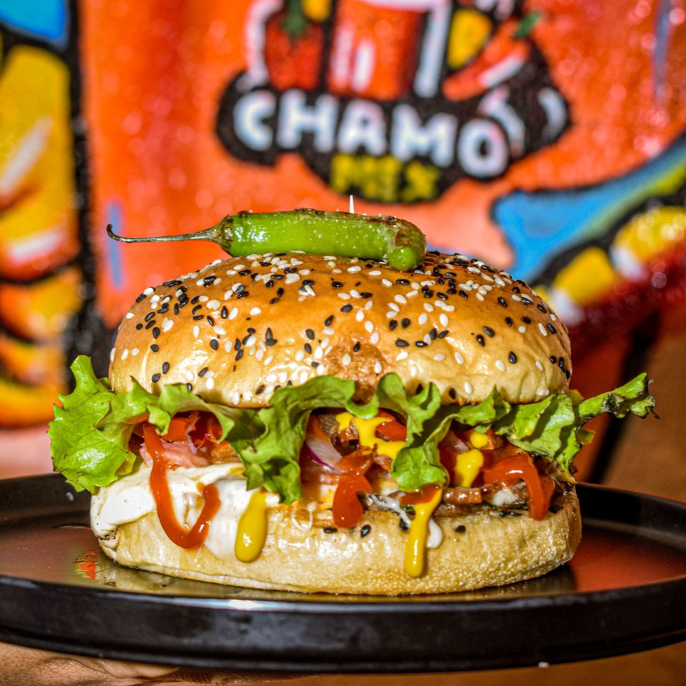 Jugosa hamburguesa con carne hecha en casa, acompañada de crujiente tocino, con delicioso queso amarillo y queso Oaxaca derretido. Acompañada de los vegetales y aderezos de tu preferencia. ¡Una explosión de sabor en cada mordida!