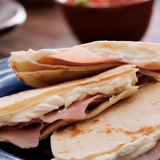 Tortilla de harina, queso Oaxaca, manchego y jamón. Acompañado de Salsa.