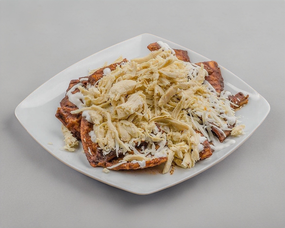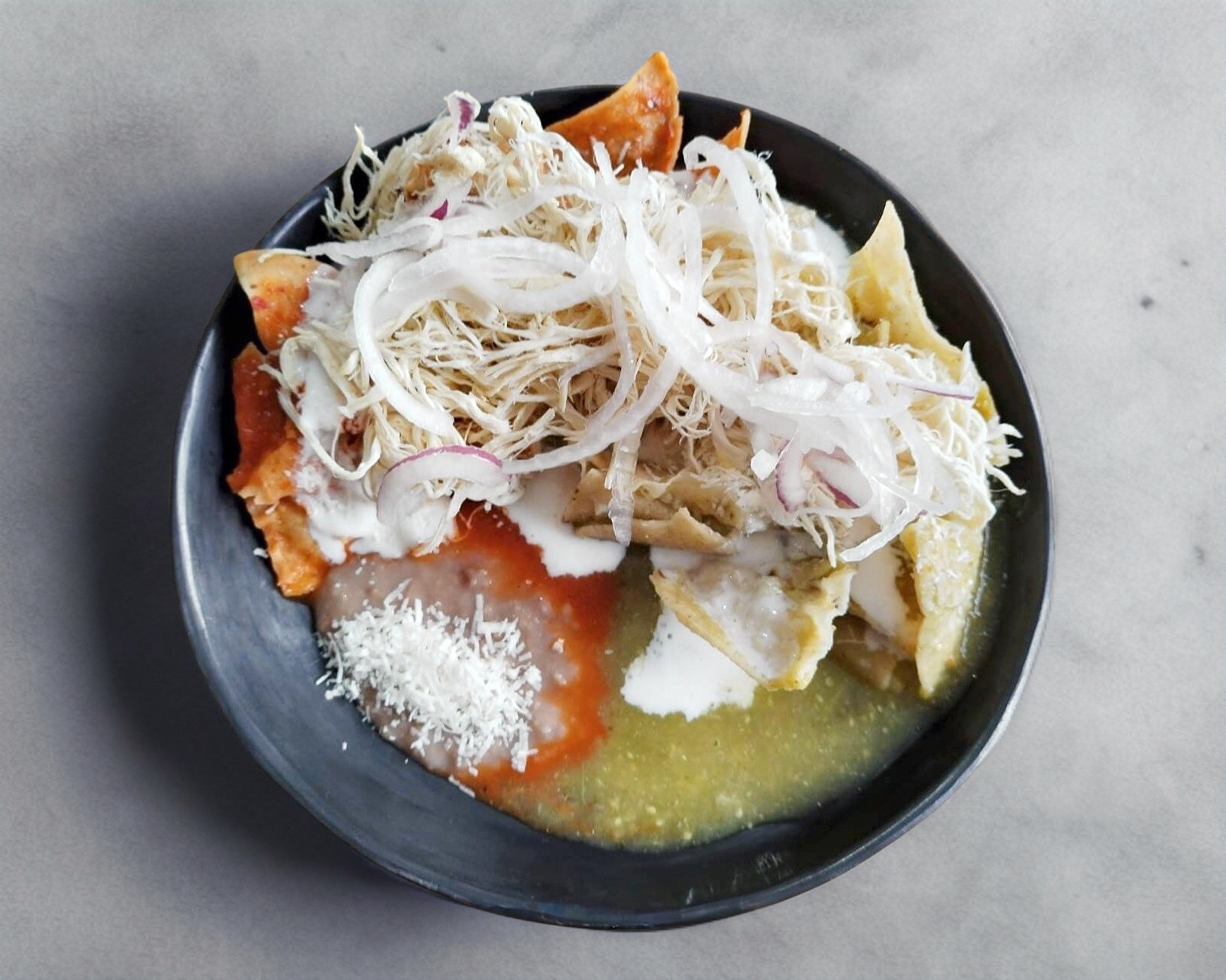Chilaquiles de delicioso mole artesanal oaxaqueño. Tu orden incluye pollo deshebrado, crema, queso, totopos horneados, cebolla, frijoles y bolillo o telera.