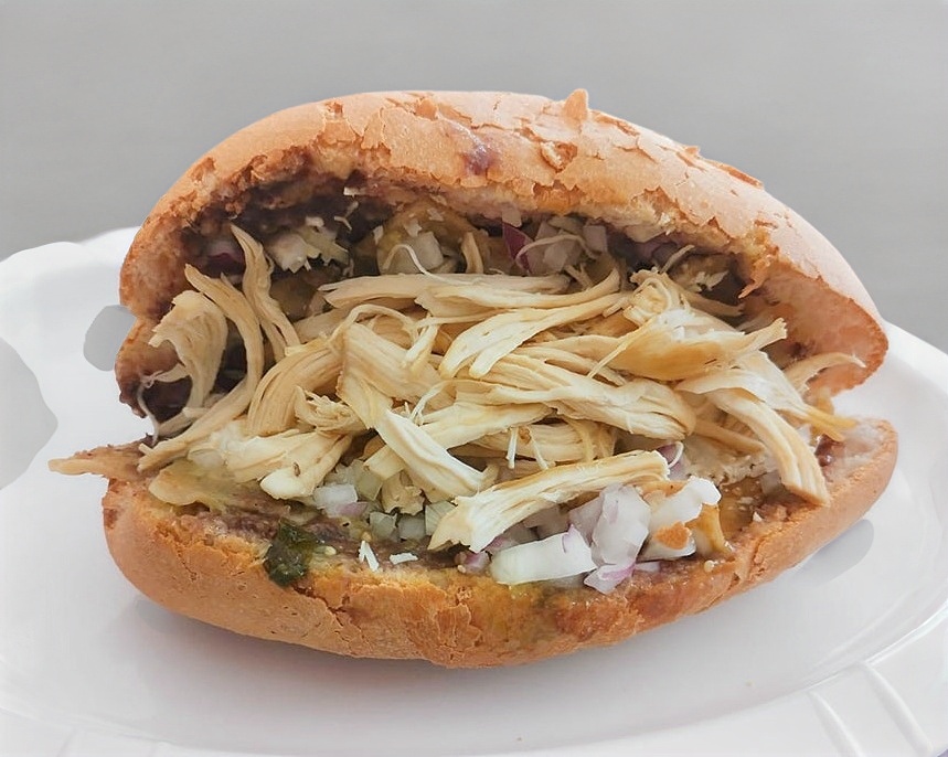 Torta de bolillo o telera con chilaquiles rojos de totopos horneados, y pollo deshebrado. (La torta se adereza con crema, queso, cebolla y frijoles).