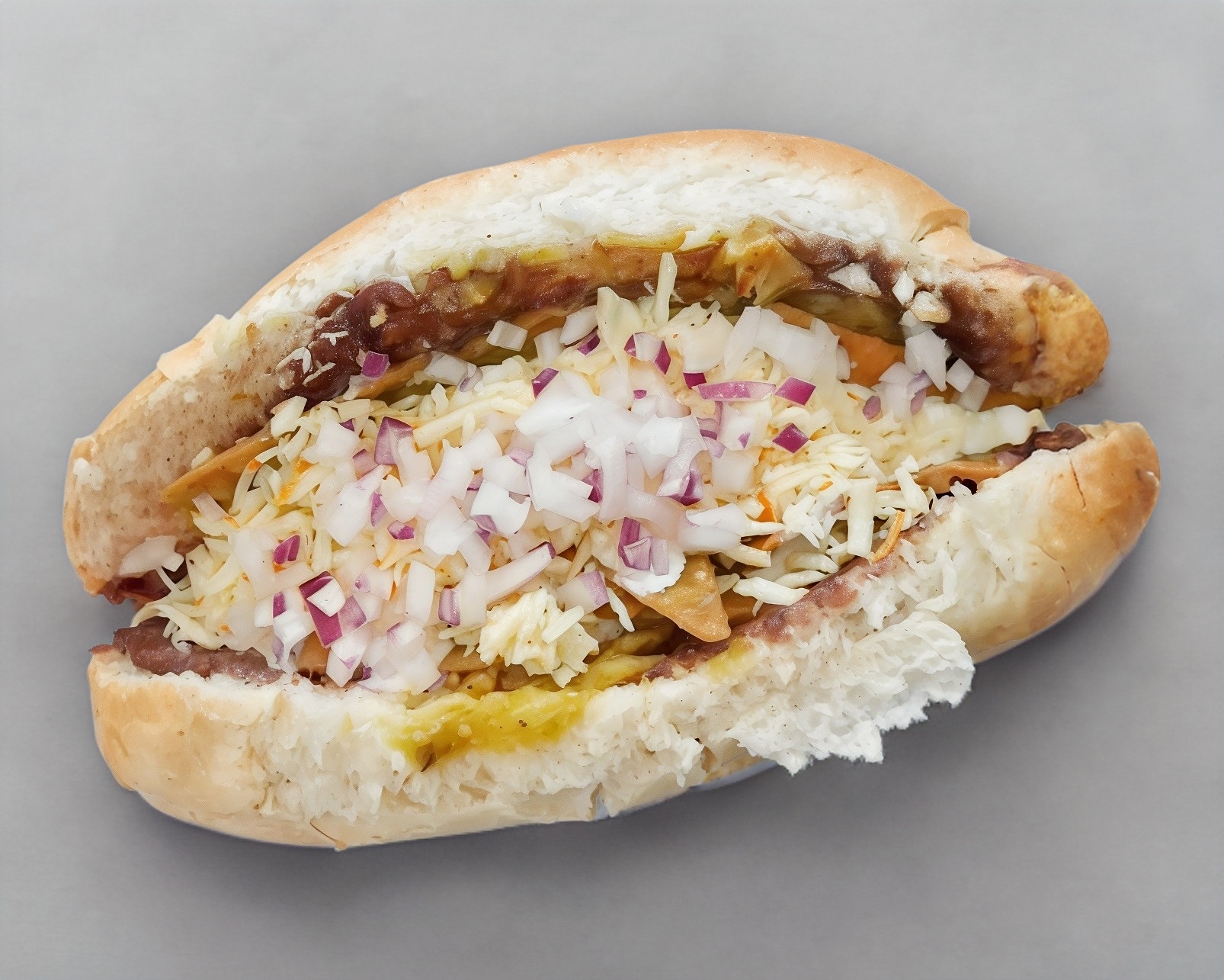 Torta de bolillo o telera con chilaquiles rojos. Contiene crema, queso, totopos horneados, cebolla, y frijoles.