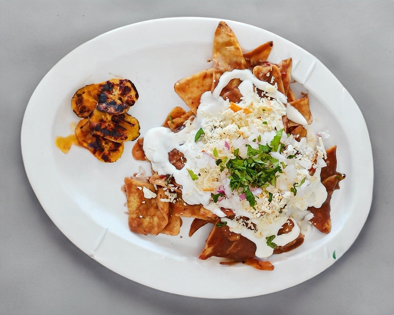 Deliciosos chilaquiles en salsa roja de guajillo. Contienen crema, queso, totopos horneados, cebolla, frijoles y bolillo o telera.