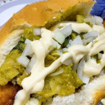 Torta rellena de chilaquiles en salsa de habanero muy picante, frijoles, crema, queso y lechuga.